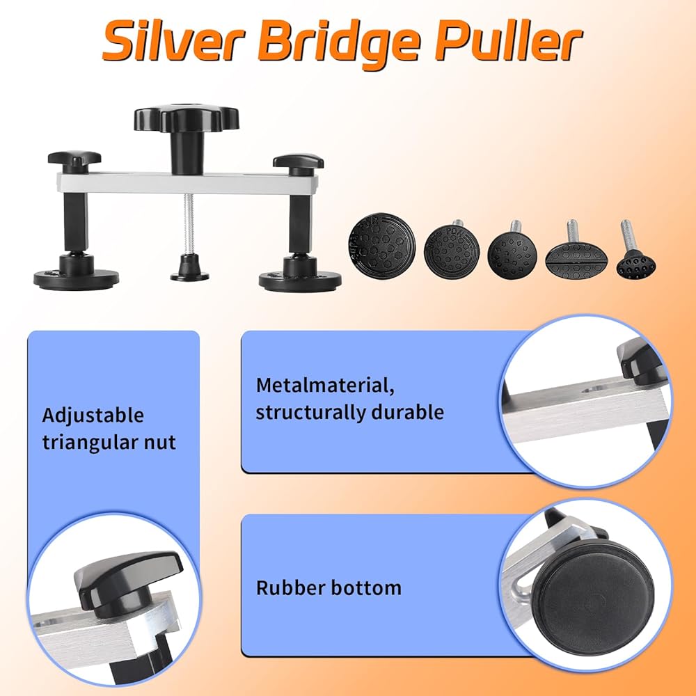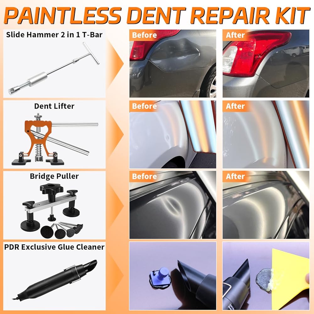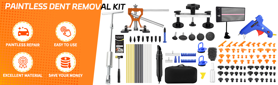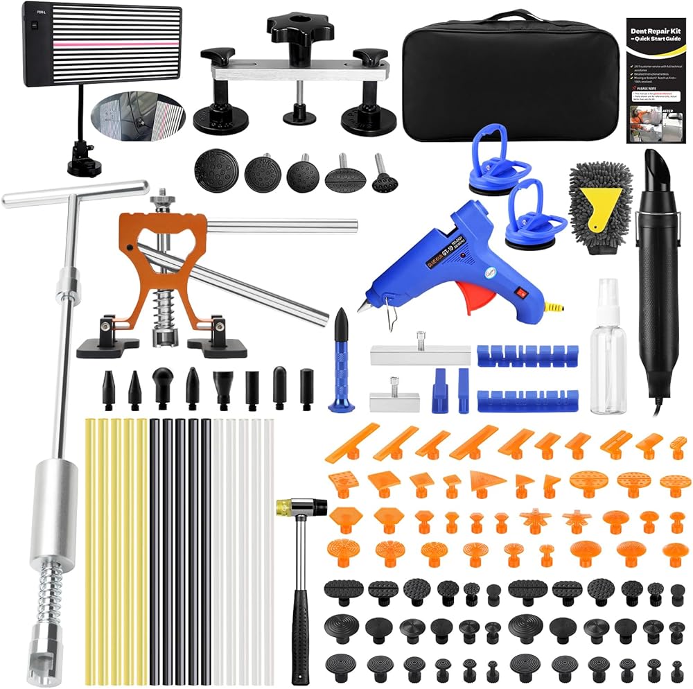 🔧مجموعة PDR لإزالة الانبعاجات الاحترافية: تشتمل مجموعة أدوات إصلاح الانبعاجات غير المطلية هذه على كل ما تحتاجه لسحب الانبعاج بكفاءة - لوح تثبيت LED، ومسدس هواء ساخن، وقضيب على شكل حرف T، وساحب الجسر، ورافع الانبعاج، وعلامات غراء الكمبيوتر، وأدوات الضرب، ومسدس غراء 100 وات، والمزيد. مثالية لإصلاح صدمات أبواب السيارة، وأضرار البرد، والخدوش الكبيرة، دون الإضرار بالطلاء؛ لا تنطبق تجاعيد الجسم. (مناسبة للمركبات ذات الطلاء الأصلي)