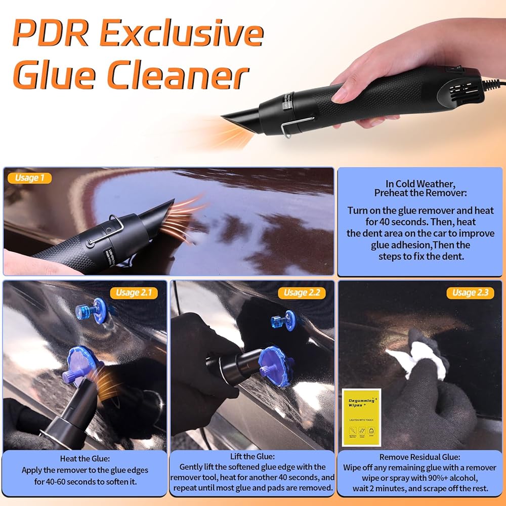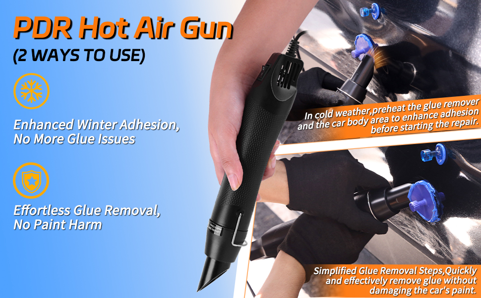 🔥 مسدس حراري 2 في 1 لالتصاق أقوى وإزالة سهلة للغراء - فعال بشكل خاص في الشتاء: يضمن مسدسنا الحراري ثنائي الأغراض إصلاحًا موثوقًا للانبعاجات على مدار العام. قم بتسخين منطقة الانبعاج لزيادة قوة ربط الغراء بشكل كبير - وهو أمر مهم بشكل خاص في الطقس البارد عندما تفقد أعواد الغراء الالتصاق بشكل طبيعي. قم بإزالة الغراء المتبقي بسرعة دون الإضرار بطلاء السيارة. ترقية لا بد منها لتحقيق عمليات سحب قوية وإصلاحات نظيفة في الشتاء أو البيئات ذات درجات الحرارة المنخفضة.