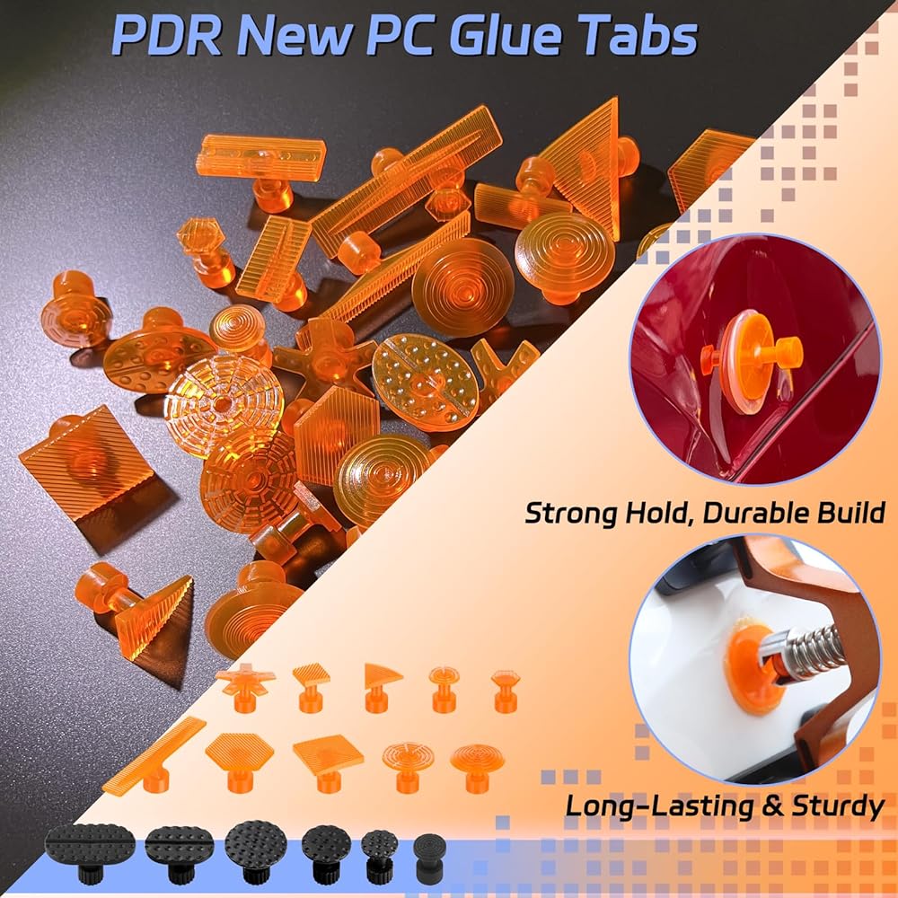 🟠 ألسنة غراء البولي كربونات الممتازة وألسنة متعددة الأشكال لجميع أنواع الانبعاجات: على عكس ألسنة ABS العادية، فإن عروات الغراء المصنوعة من مادة البولي كربونات لدينا أكثر متانة وأكثر مرونة وتوفر التصاق أقوى عند إقرانها بغراء PDR. تتضمن أشكالًا وأحجامًا مختلفة - مستديرة، وبيضاوية، ومربعة، ومزخرفة - لتتناسب تمامًا مع الضربات الصغيرة، والخدوش البَرَدية، والخدوش العميقة، وأضرار الجسم الكبيرة.