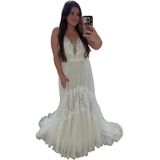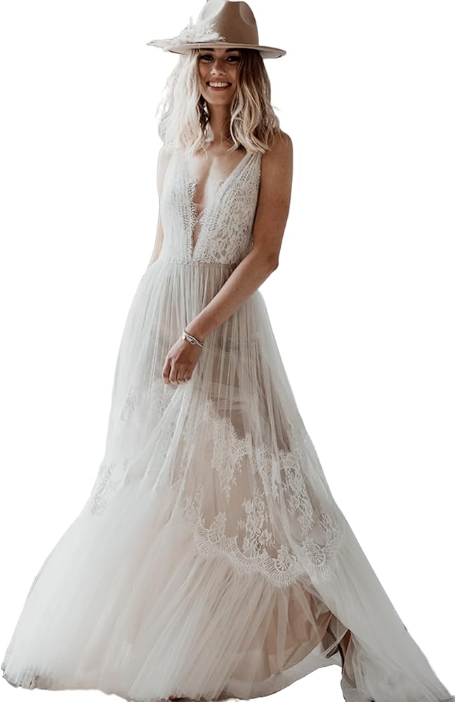 الميزات: يتم تعليق فستان الزفاف غير الرسمي هذا على أشرطة مجمعة، مما يبرز خط العنق العميق على شكل حرف V، والجوانب الغارقة، والظهر الغارق على شكل حرف V. يتميز فستان الزفاف هذا من التول والدانتيل بتصميم على شكل حرف A مكشكش بشكل رائع، مع حزام خصر رفيع وذيل محكمة.