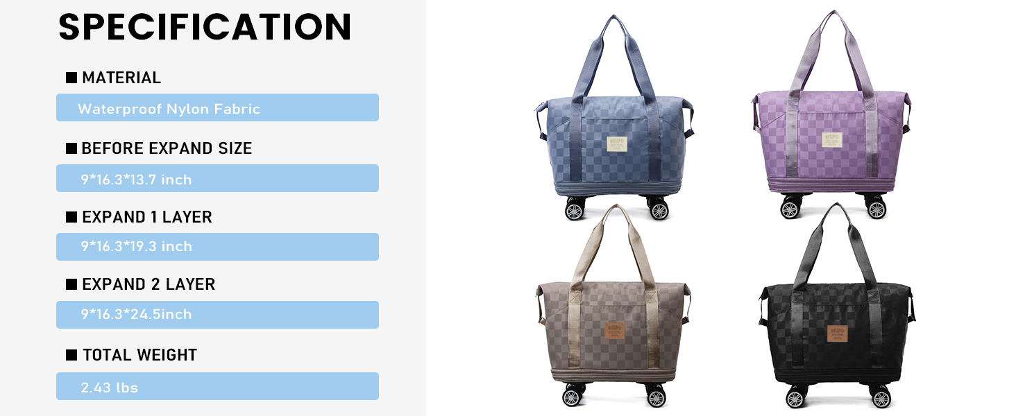خيارات توسيع متعددة الاستخدامات: حقيبة السفر المصنوعة من القماش الخشن ذات العجلات مثالية للرحلات القصيرة، ورحلات العمل، ورحلات نهاية الأسبوع، واللياقة البدنية، وما إلى ذلك. قم بفك السحاب السفلي بسهولة لضبط السعة، وتوسع حقيبة القماش الخشن المتدحرجة ذات العجلات مساحة التخزين من 28 لترًا إلى 43 لترًا حتى 58 لترًا لتلبية احتياجات السفر المختلفة، ويمكن طيها أثناء عدم الاستخدام، وتستهلك مساحة صغيرة وسهلة التخزين.