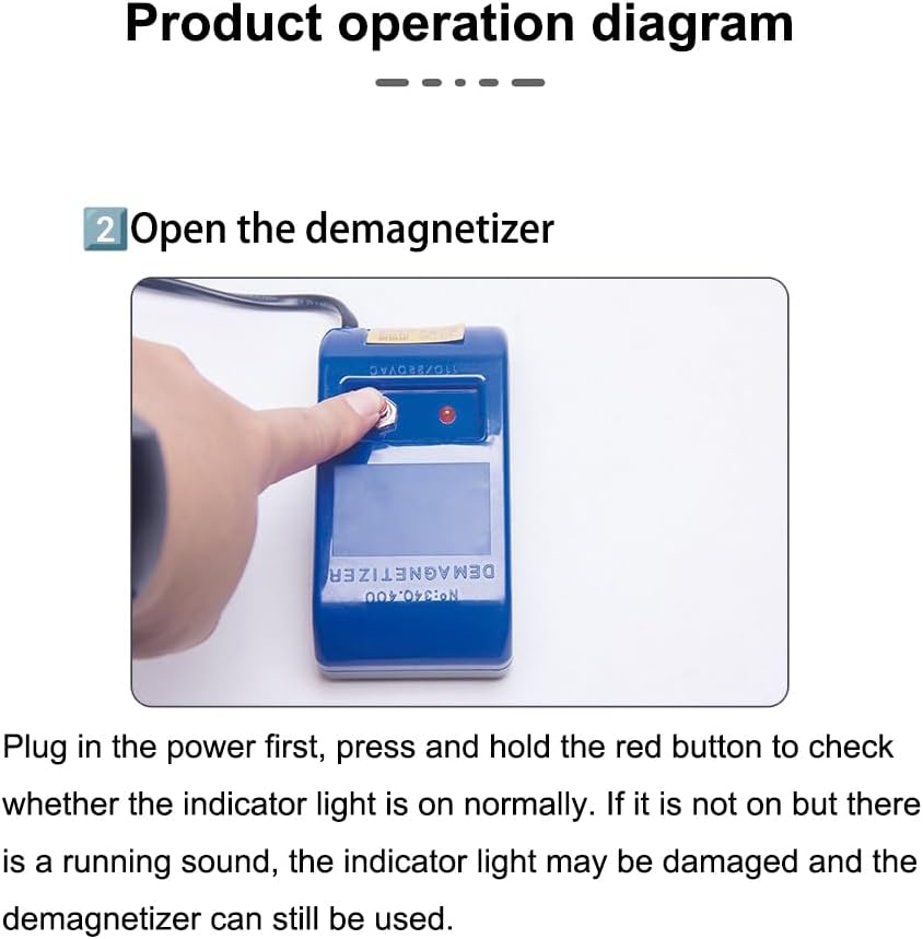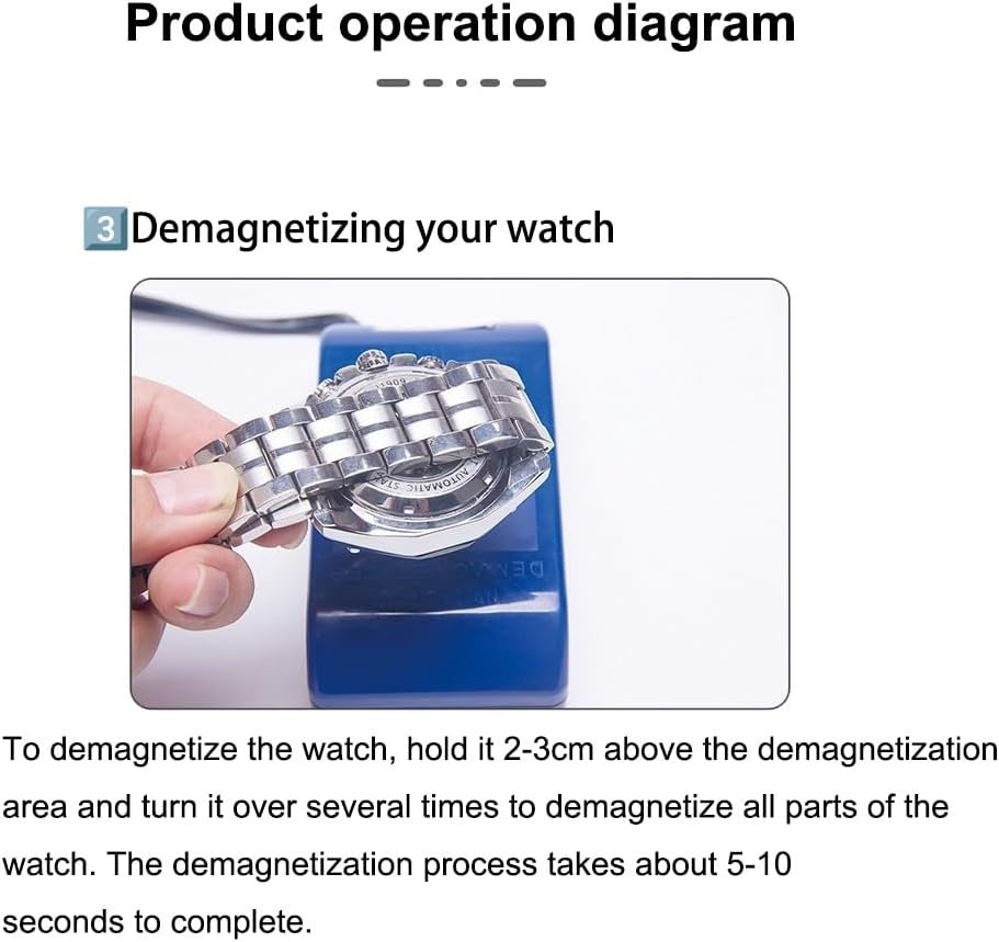 【One-Button Demagnetization Operation】– Plug in power, press and hold the red button to activate. Hold the watch 2-3cm above the demagnetization area and move it slowly for 5-10 seconds to complete degaussing.