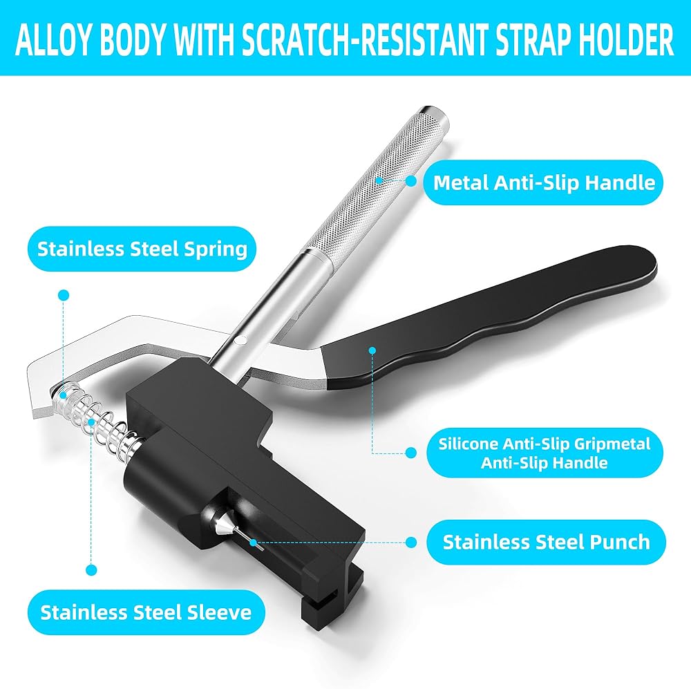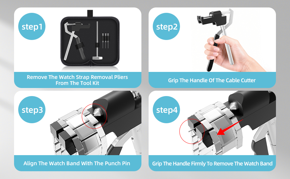 [تشغيل بسيط]: قم بإزالة أداة إزالة حزام الساعة من المجموعة. أمسك بمقبض الأداة، ثم قم بمحاذاة الحزام مع دبوس الثقب، ثم اضغط على المقبض بقوة لفصل الحزام.