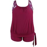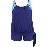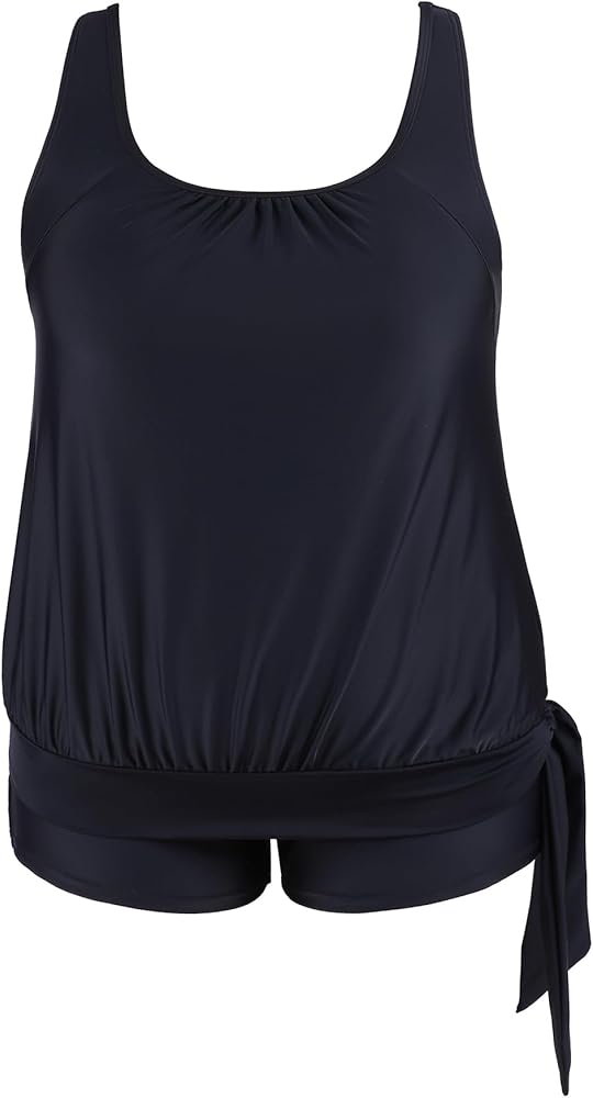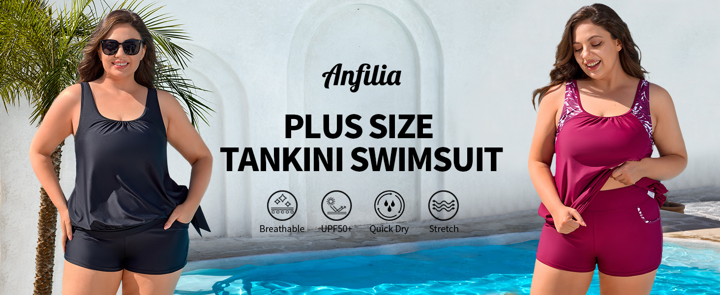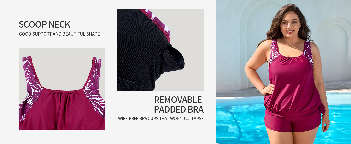 بدلة سباحة تانكيني بمقاس كبير مكونة من قطعتين: بدلة سباحة تانكيني نسائية بمقاس كبير مع شورت سباحة نسائي عالي الخصر وسروال داخلي مدمج، وجيبين جانبيين لتخزين الهواتف والمفاتيح والأشياء الثمينة الأخرى عند ممارسة بعض الرياضات المائية وأنشطة الشاطئ