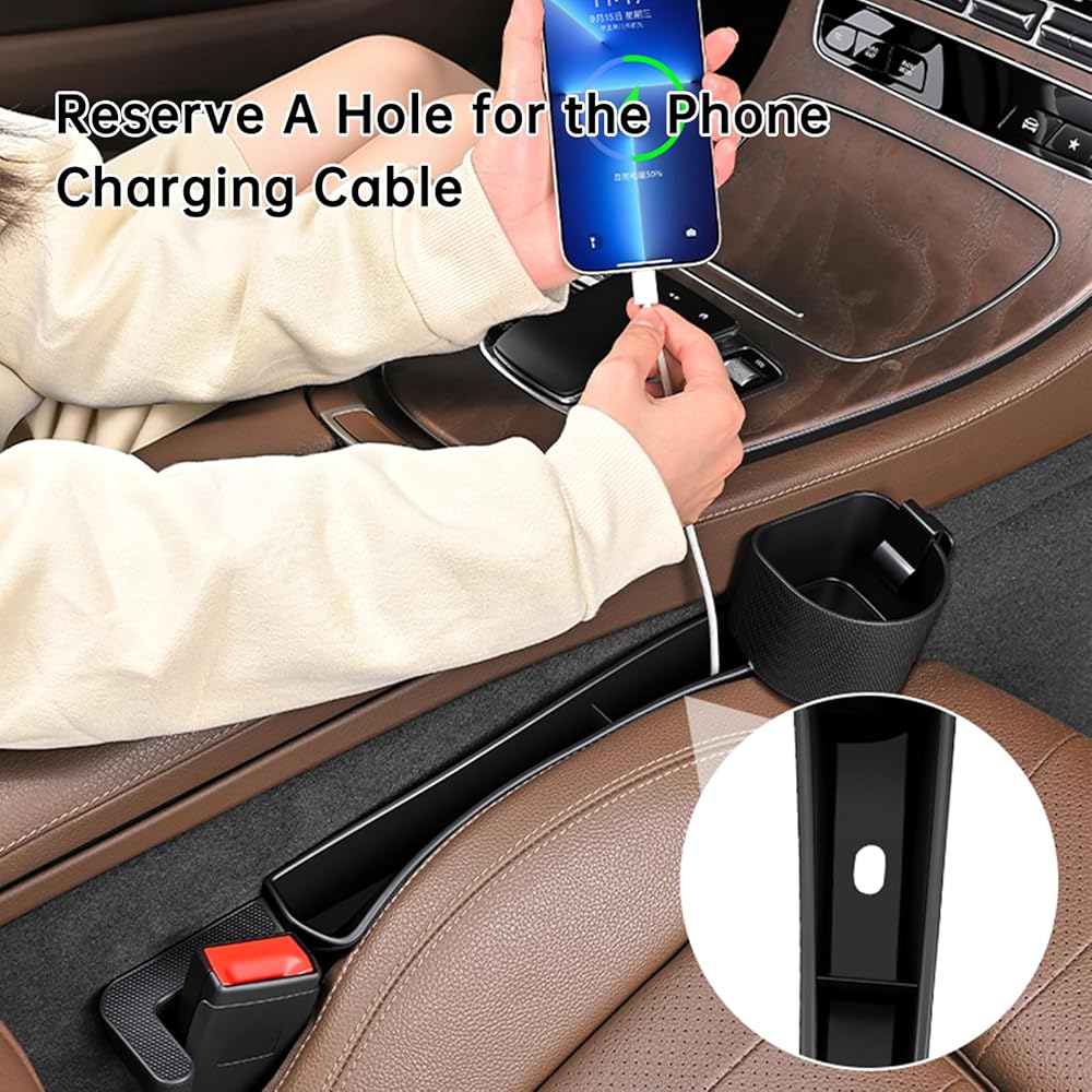 End Frustrating Drops & Searches - Tired of losing your phone, keys, or coins in the abyss between your seat and console? Our car seat gap filler acts as a seamless barrier, solving this common annoyance and keeping your essentials within easy reach for a safer, more organized drive. Premium TPE Material: Safe, Durable & Flexible - Crafted from high-quality, this gap filler is soft yet incredibly durable. It boasts excellent elasticity to fit snugly without scratching your seats, and remains stable through temperature extremes, ensuring long-lasting performance. 2-in-1 Design: Fall Protection Barrier + Handy Organizer - More than just a filler, it features a convenient storage slot for cards, coins, or toll tickets. The integrated bottom charging port allows you to route a cable neatly, enabling easy phone charging without cluttering your cabin. Universal Fit and 10-Second Installation — Specifically designed for center console spaces where the console sits higher than the seat and the gap exceeds 1 inch. these seat covers are plug-and-play: simply slide them into the gap for secure placement. The custom cutout ensures perfect alignment with the seatbelt buckle, without interfering with seat adjustment functionality.