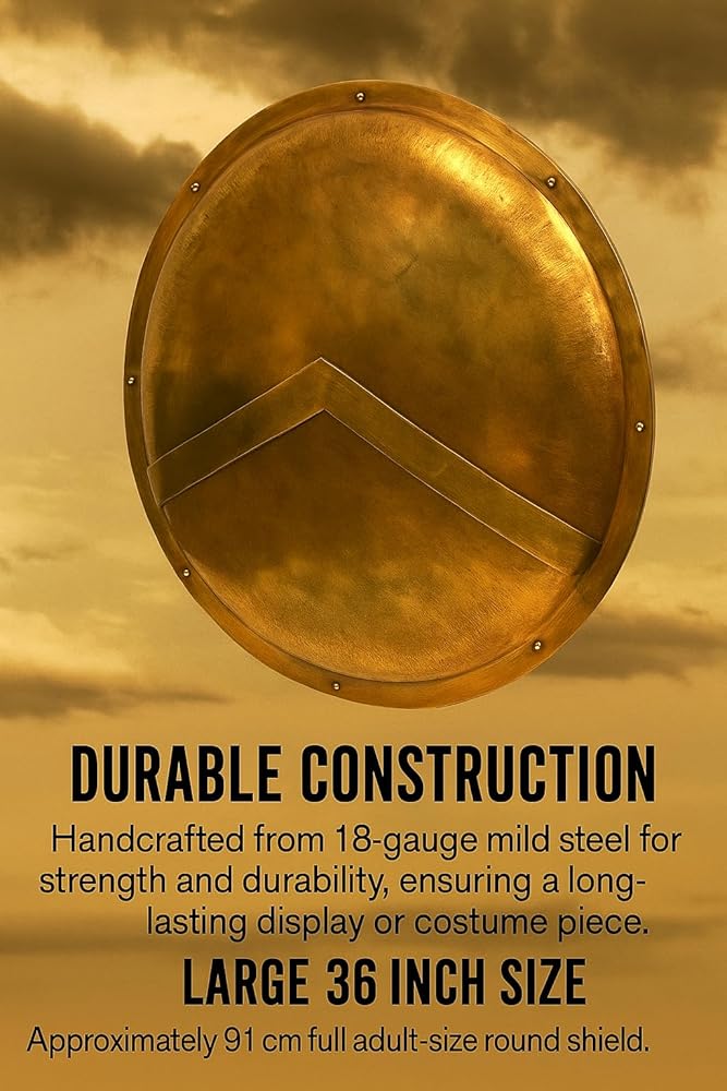 PRODUCT DETAILS Product Description: Bring home the power and glory of ancient Sparta with this 36 Inch Spartan 300 Movie Shield Replica. Made from 18-gauge mild steel, this handcrafted round shield captures the iconic design of the legendary warriors led by King Leonidas. The antique brass finish adds an authentic, battle-worn look, making it the perfect centerpiece for costume play, medieval reenactments, or as a striking decorative wall piece. Whether you're a collector, cosplayer, or history lover, this shield is built to impress with its large size, durable construction, and detailed craftsmanship. Display it proudly, wear it as part of a costume, or gift it to someone who admires warrior history and Greek mythology. ⚔️ Own a piece of Spartan history – strength, courage, and honor in one shield!
