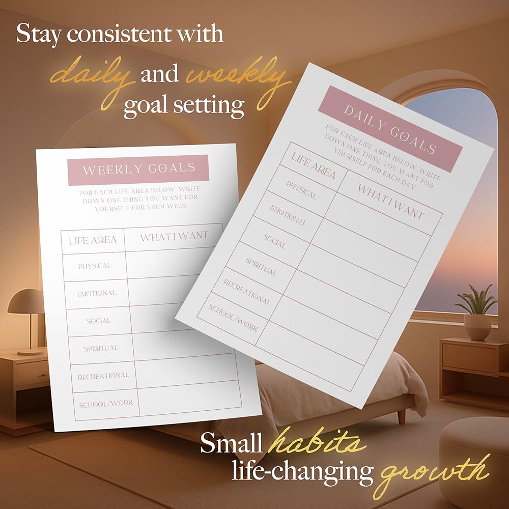 بناء إجراءات وعقلية أفضل: يتضمن صفحات موجهة لتحديد الأهداف، والتأكيدات، وتمارين العافية لتحسين الإنتاجية والتركيز والرفاهية العاطفية.