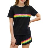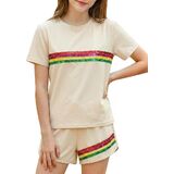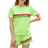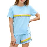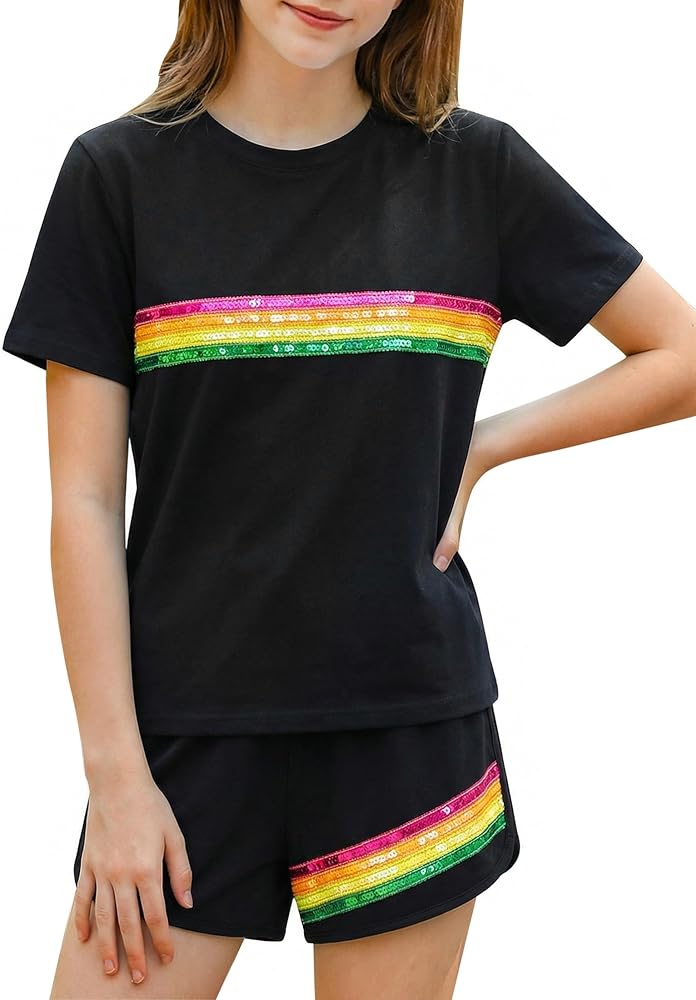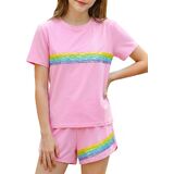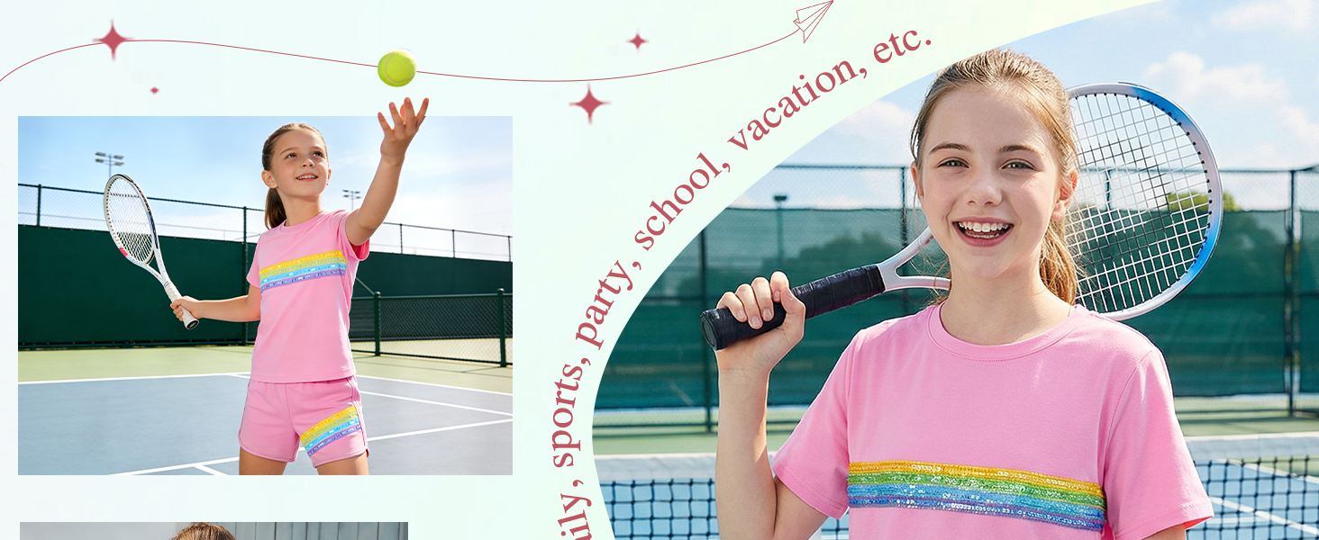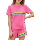 Style Features: Top: Loose straight-tube fit, short-sleeved round neck design, comfortable and breathable, convenient for children's activities; Bottoms: Sport shorts fit, slightly loose legs, with trim design, allowing for freedom of movement and a sporty feel. Overall style: Sport casual style, simple with elements of vitality. Design Highlights: Sequin Stripes: A pink base color paired with colorful sequin stripes in yellow, blue, green, and other colors creates a visual highlight, full of childlike fun and summer vitality. Matching Set: The matching set design reduces the difficulty of pairing, and the overall look is coordinated and unified. Fusion of Sport and Casual: Combines the comfort and practicality of sportswear with the fashion sense of sequin elements, suitable for multiple scenarios. Suitable for: Age group: Girls aged 6-12, children who like sweet, lively, and sport casual styles.