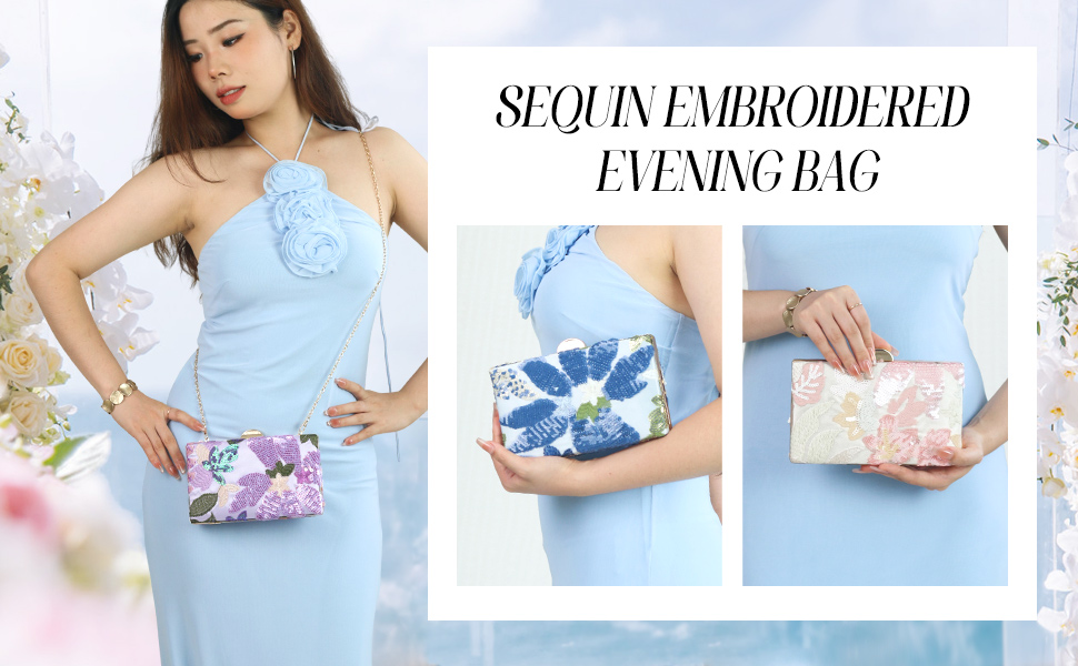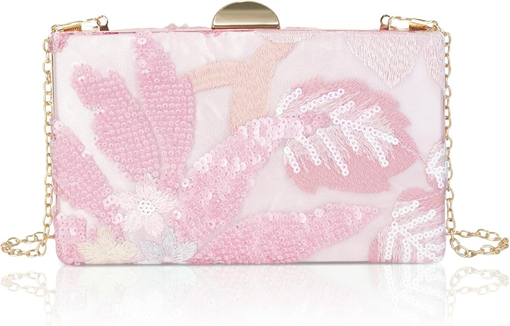 تفاصيل الزهور والترتر: نمط الزهور المطرز والترتر اللامع، مع إطار معدني قوي، يجعل من محفظة السهرة هذه إكسسوارًا خالدًا وملفتًا للنظر (مصنوعة يدويًا بحيث تختلف شكل كل حقيبة قليلاً).