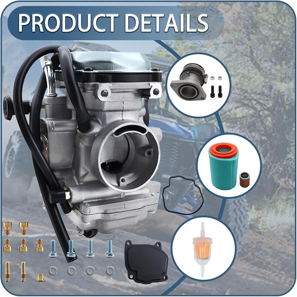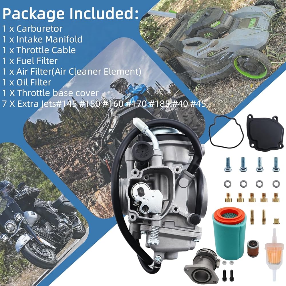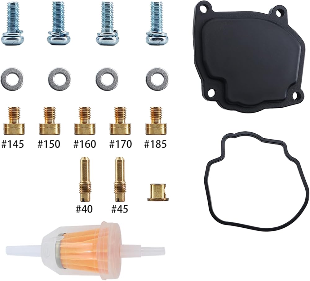 الحزمة الكاملة - تتضمن 1 × مكربن، 1 × مشعب السحب، 1 × كابل خانق، 1 × فلتر الوقود، 1 × فلتر الهواء (عنصر منظف الهواء)، 1 × فلتر الزيت، 1 × غطاء قاعدة الخانق، 7 × طائرات إضافية #145 150 160 170 185 40 45.