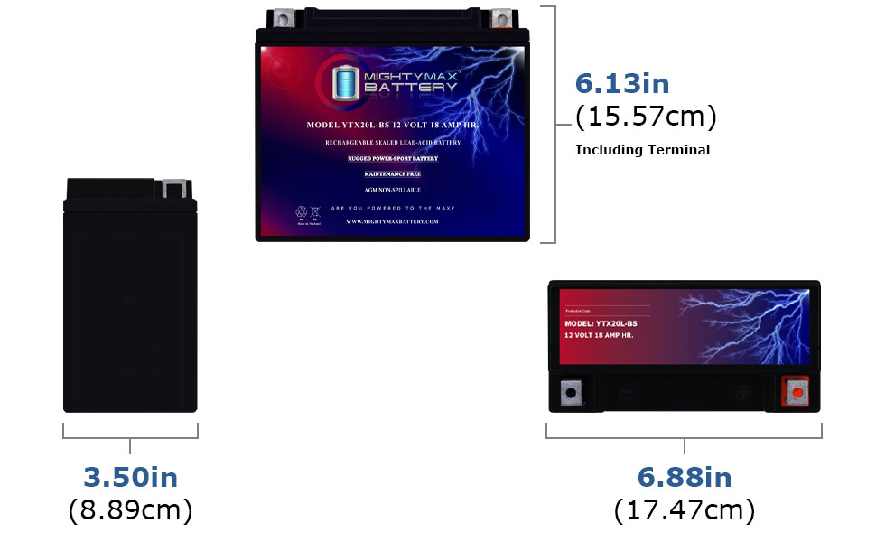 الأبعاد: 6.88 بوصة × 3.50 بوصة × 6.13 بوصة. القطبية: سلبي على اليسار، إيجابي على اليمين. القائمة مخصصة للبطارية والمسامير فقط. لا يتضمن أي سرج سلكي أو ملحقات تثبيت.