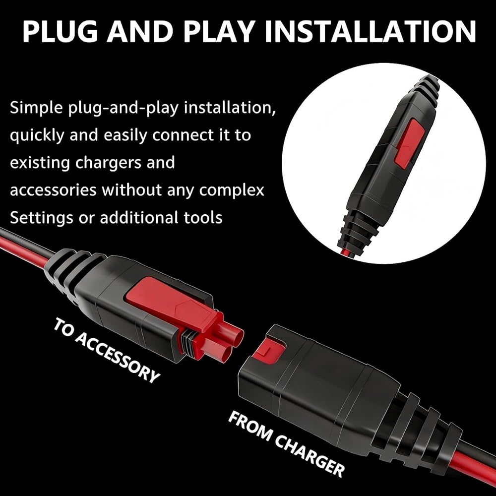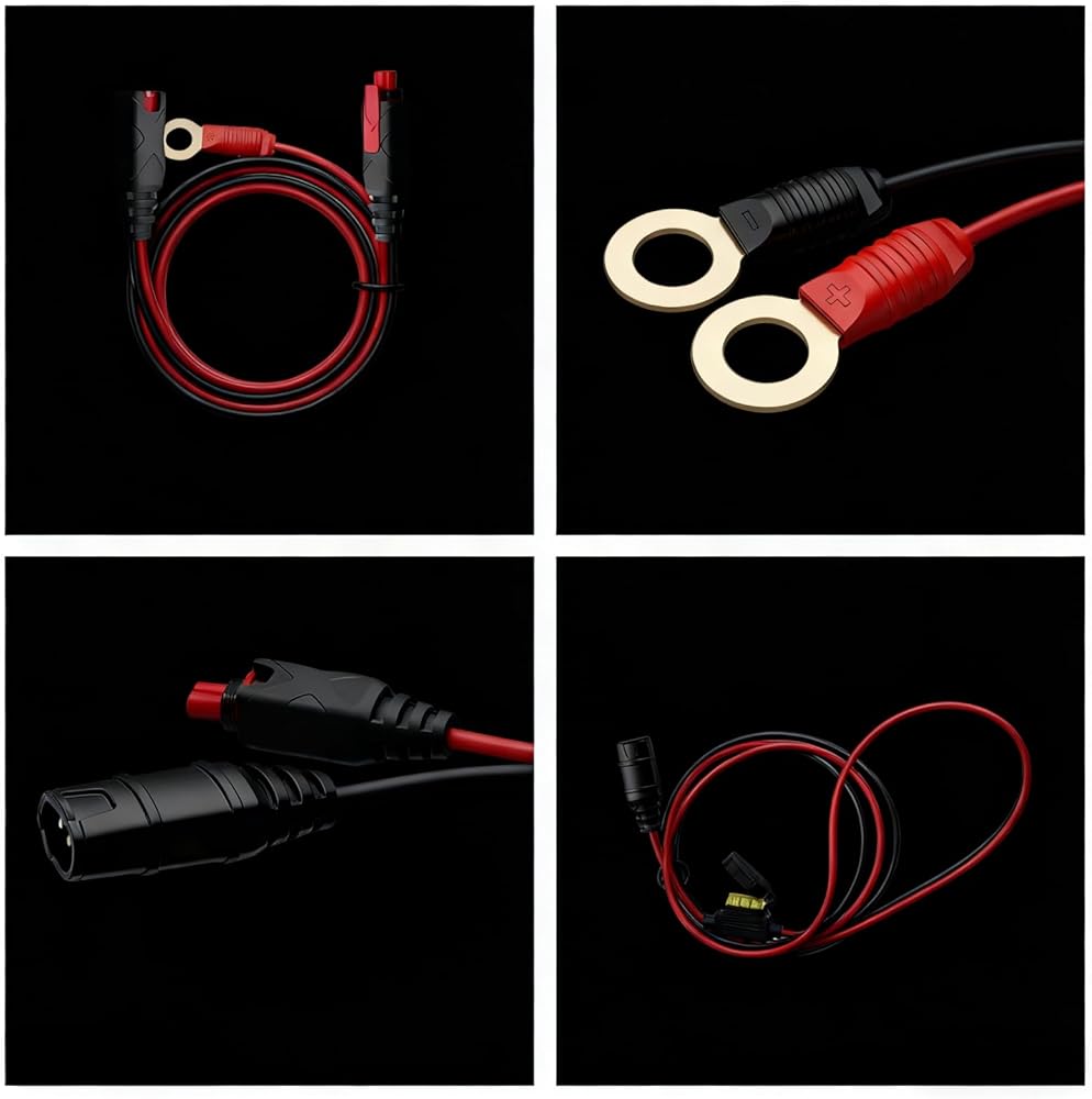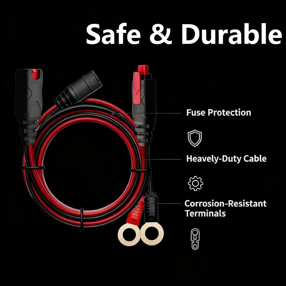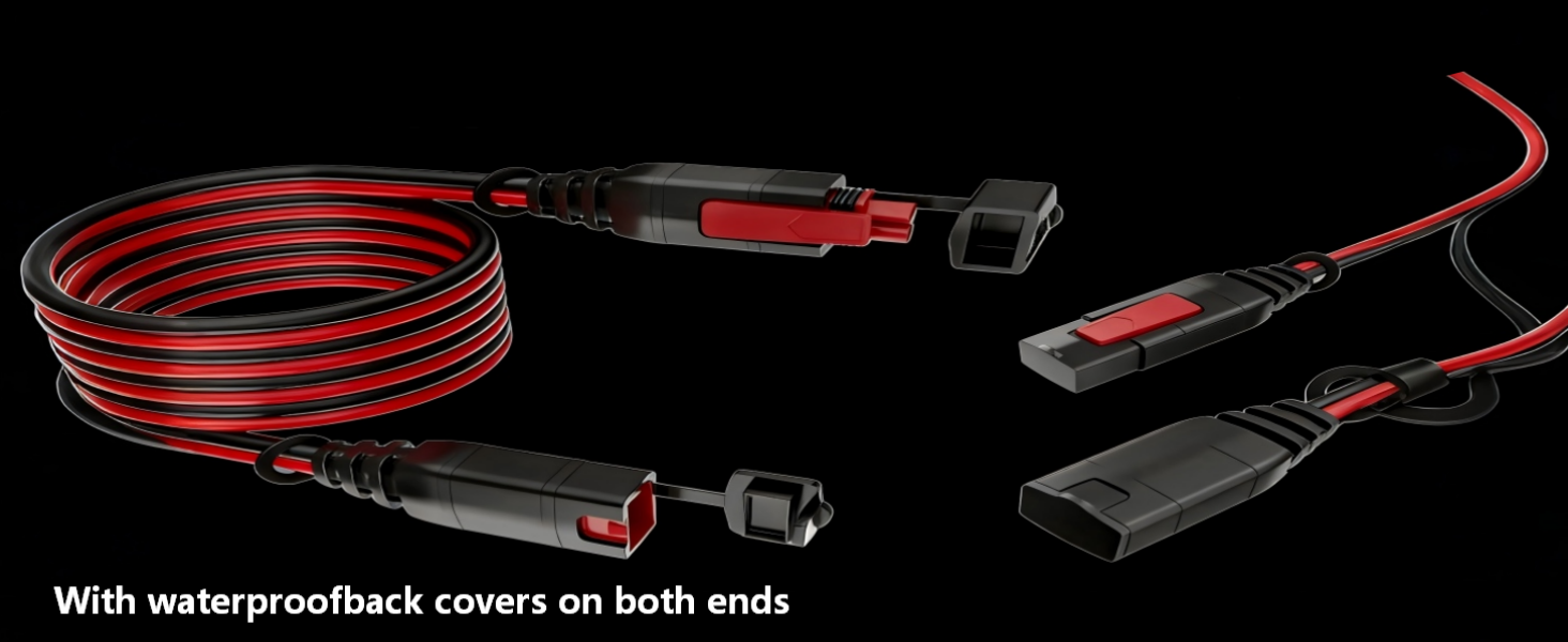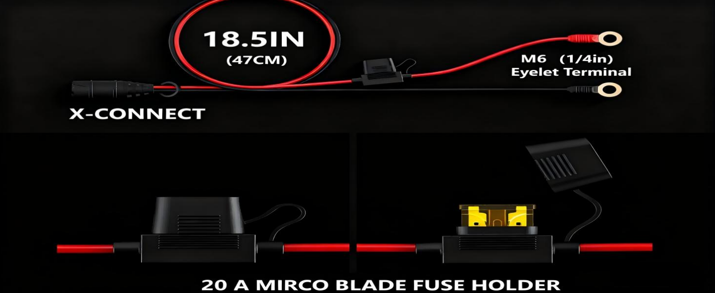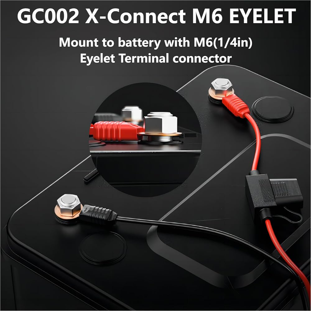 المواصفات الفنية GC002: طرف ثقب M6 (1/4 بوصة) مع مصهر 20 أمبير وغطاء مقاوم للماء، سلك نحاسي نقي 16AWG لشحن البطارية مما يضمن تعزيز السلامة والحماية.