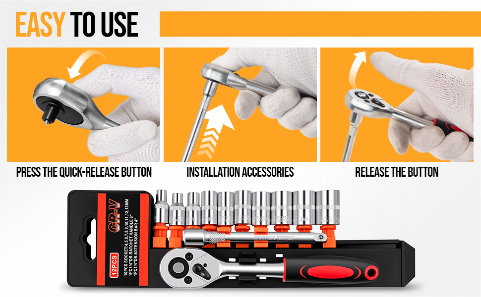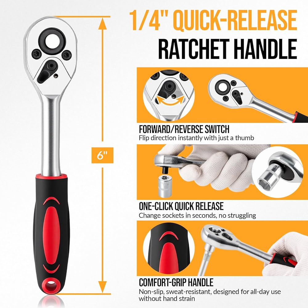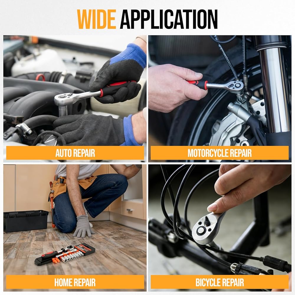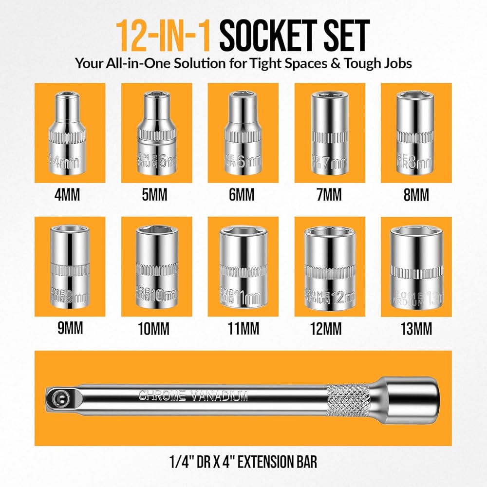 • مجموعة أدوات صغيرة كاملة: تتضمن مجموعة المقابس الصغيرة هذه مجموعة كاملة من المقابس (4، 5، 6، 7، 8، 9، 10، 11، 12، 13 ملم)، ومفتاح ربط السقاطة، وشريط تمديد. إنه مصمم للإصلاحات المنزلية الشائعة وصيانة السيارة، مما يساعدك على التعامل مع المهام بدءًا من مسامير الأثاث السائبة إلى صواميل السيارات الأخرى التي يصعب الوصول إليها دون الحاجة إلى أدوات متعددة.