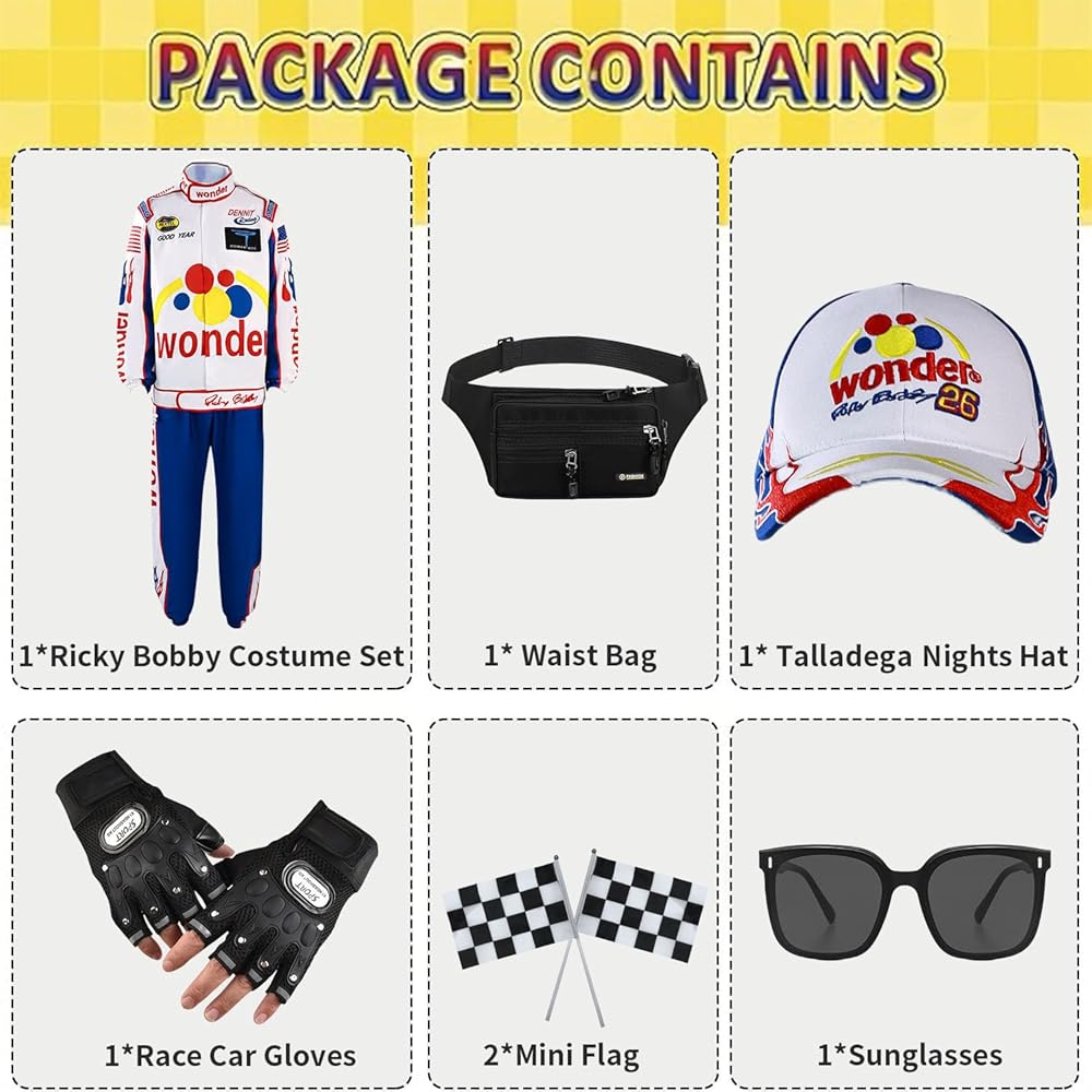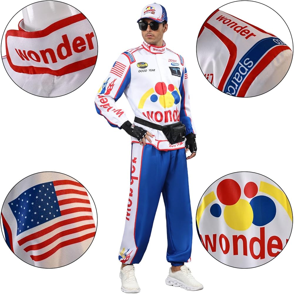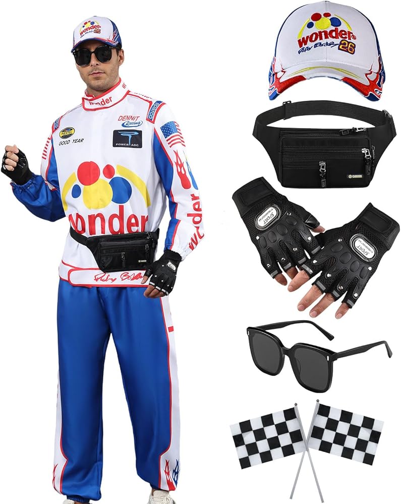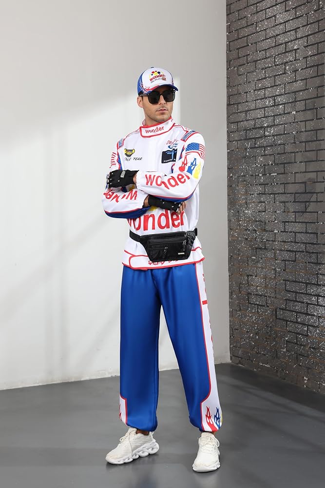 Complete 8-Piece Ensemble: This all-in-one costume set includes a retro racing pants, classic jacket, stylish hat, and 5 complementary accessories, providing everything you need for a cohesive and authentic race-inspired look—perfect for parties, Halloween, or movie-themed events.