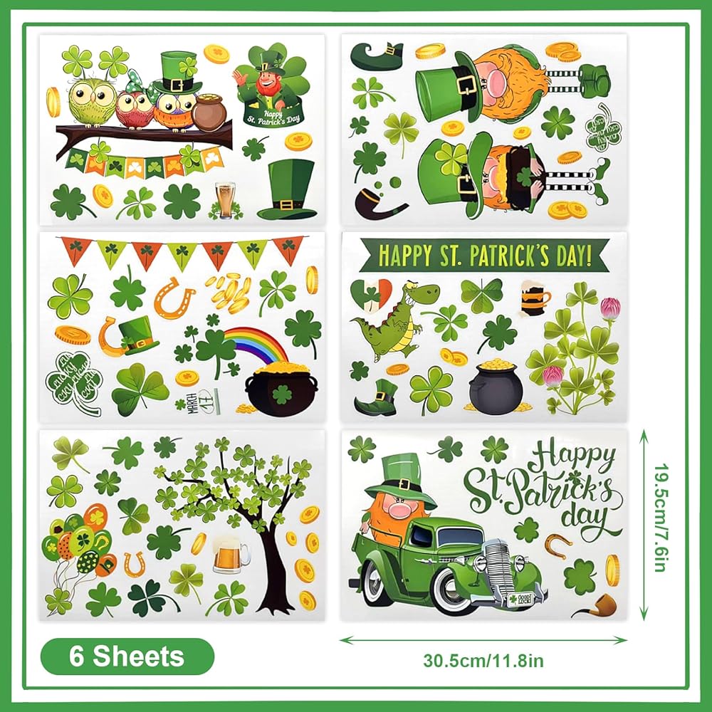 Package includes: You will get 6 Sheets 88 Pcs St Patrick's Day wall decal, and each clings size is 7.87x11.81 inch.