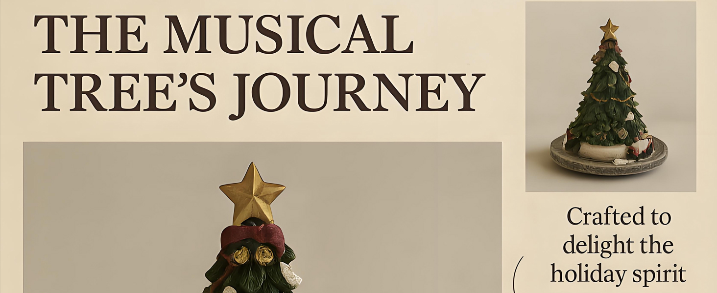 تصميم شجرة موسيقية ساحرة - شجرة عيد الميلاد من الراتنج الاحتفالي مزينة بالثلج والزخارف ونجمة ذهبية، مقترنة بقطار دوار مبهج حول القاعدة.