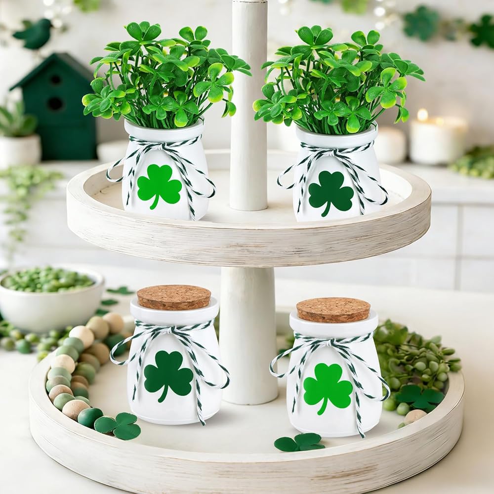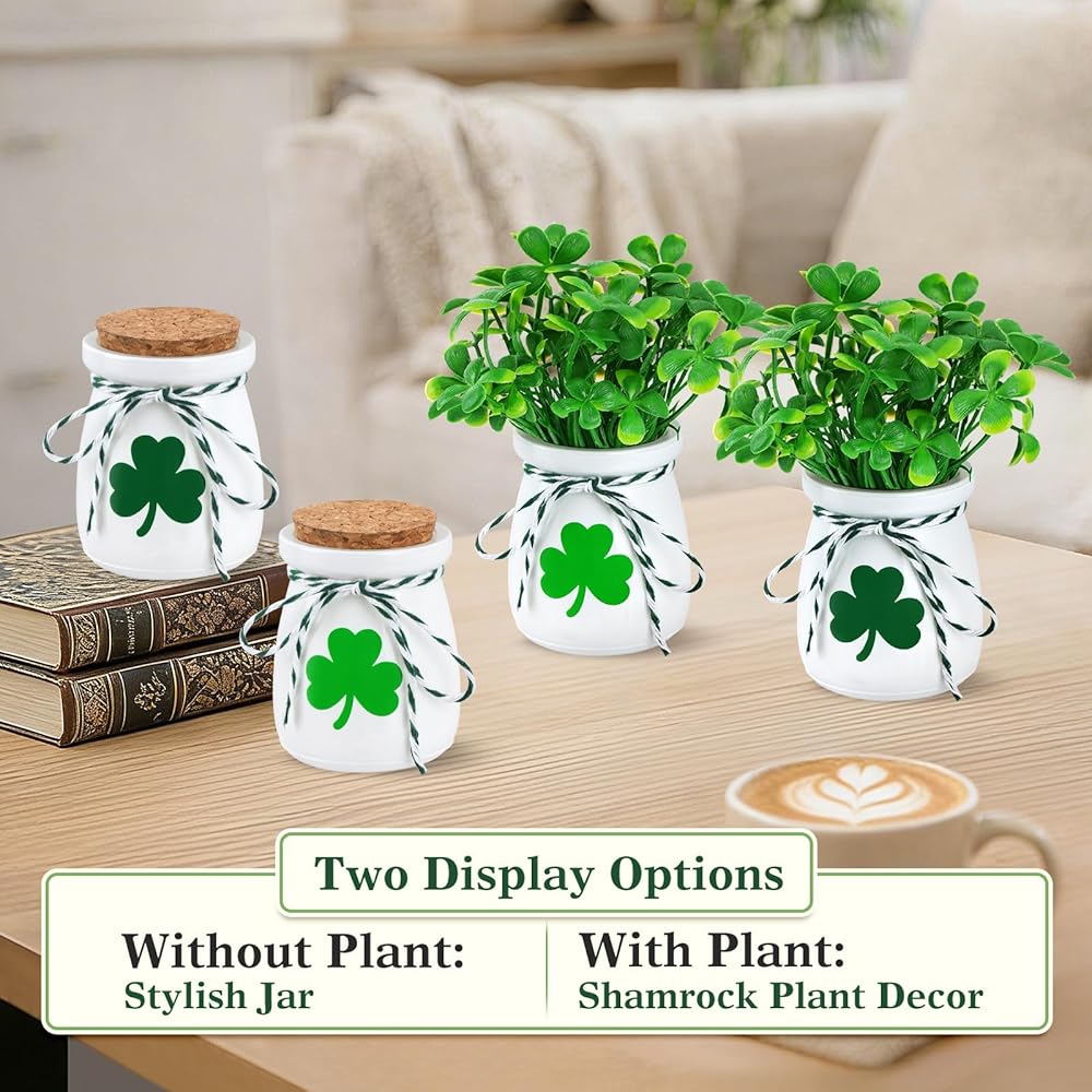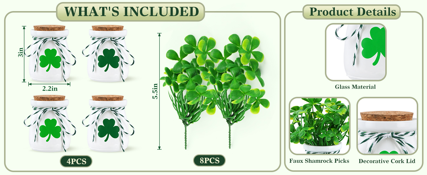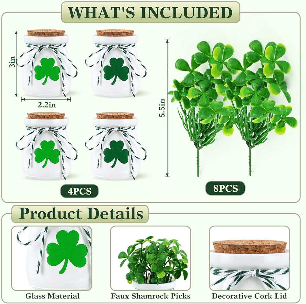 ديكور طاولة صغير لعيد القديس باتريك: تتضمن مجموعة ديكورات يوم القديس باتريك هذه 4 برطمانات زجاجية صغيرة و8 سيقان نبات النفل الاصطناعي، مصممة على شكل مزهريات نبات النفل لديكورات يوم القديس باتريك للطاولة. مثالية لإضافة st الكلاسيكية. ديكور يوم باتريك لطاولات المطبخ، ومناطق تناول الطعام، والصواني المتدرجة، وأسطح العمل