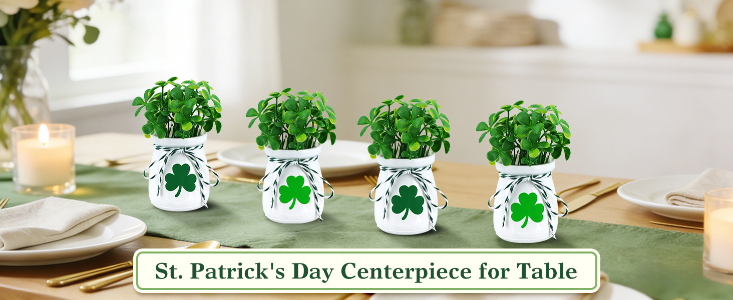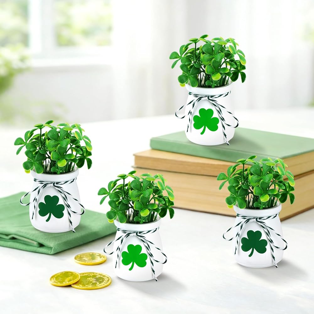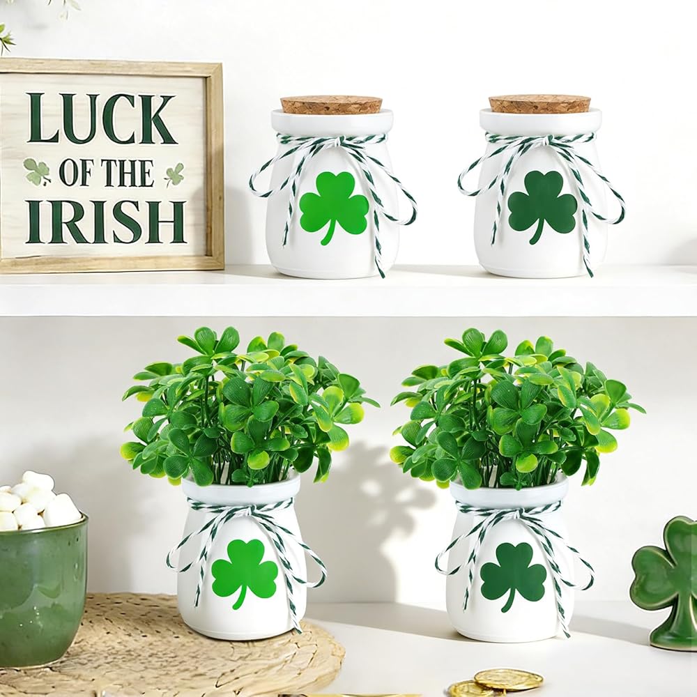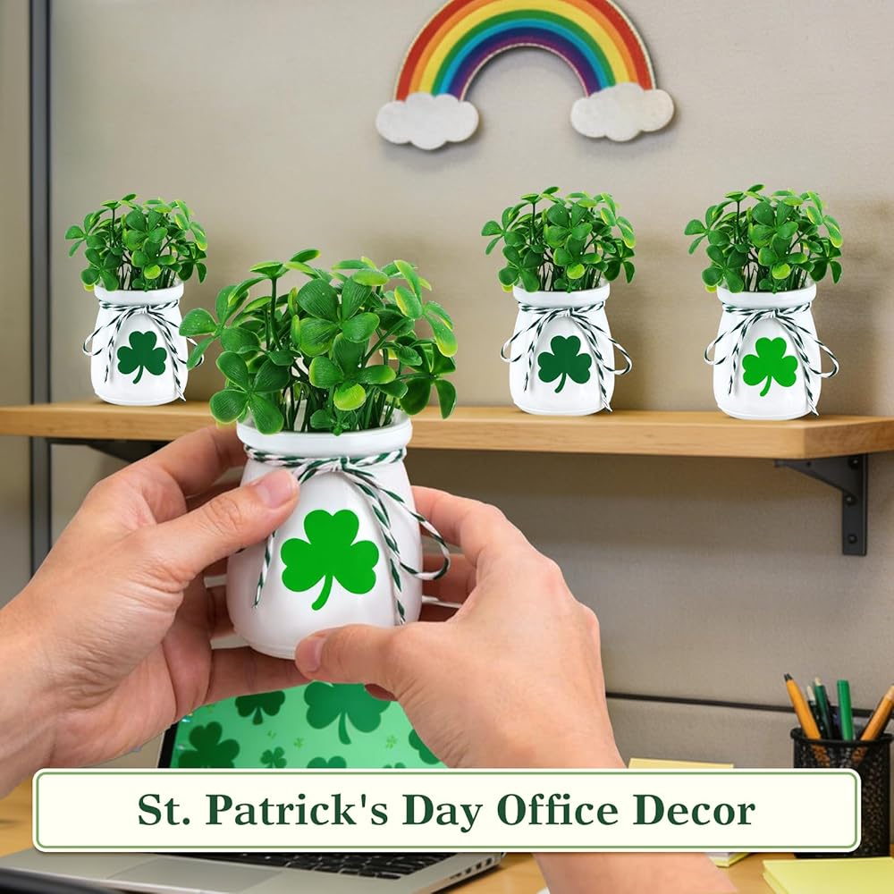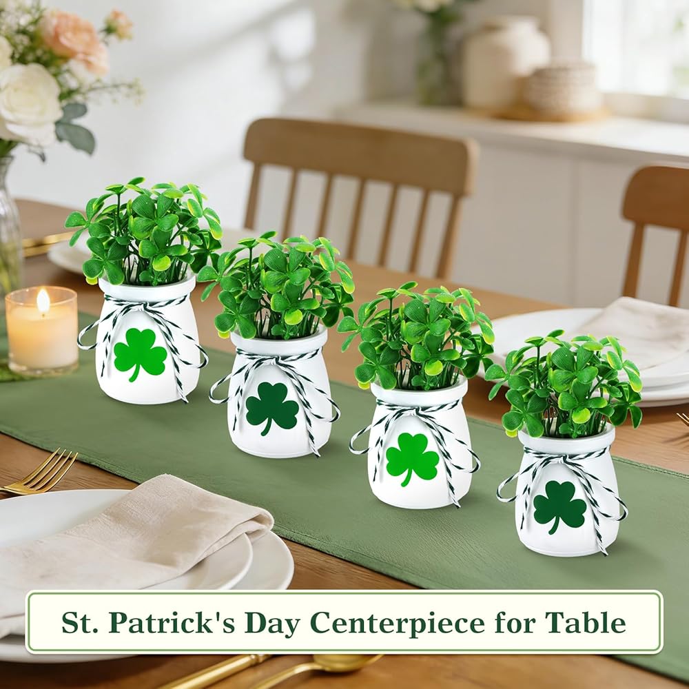 ديكور طاولة صغير لعيد القديس باتريك: تتضمن مجموعة ديكورات يوم القديس باتريك هذه 4 برطمانات زجاجية صغيرة و8 سيقان نبات النفل الاصطناعي، مصممة على شكل مزهريات نبات النفل لديكورات يوم القديس باتريك للطاولة. مثالية لإضافة st الكلاسيكية. ديكور يوم باتريك لطاولات المطبخ، ومناطق تناول الطعام، والصواني المتدرجة، وأسطح العمل