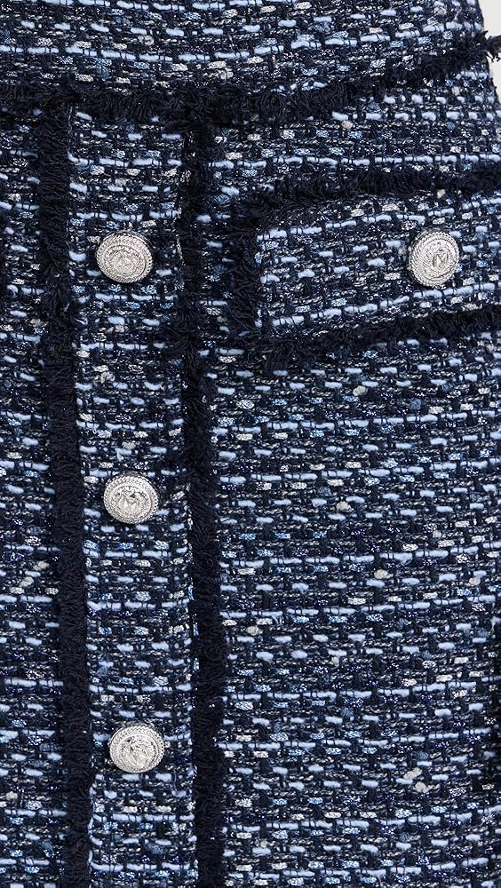 • نمط مربعات منقوش مع زخرفة مهترئة، وأزرار مزخرفة باللون الفضي وجيوب صناعية بغطاء