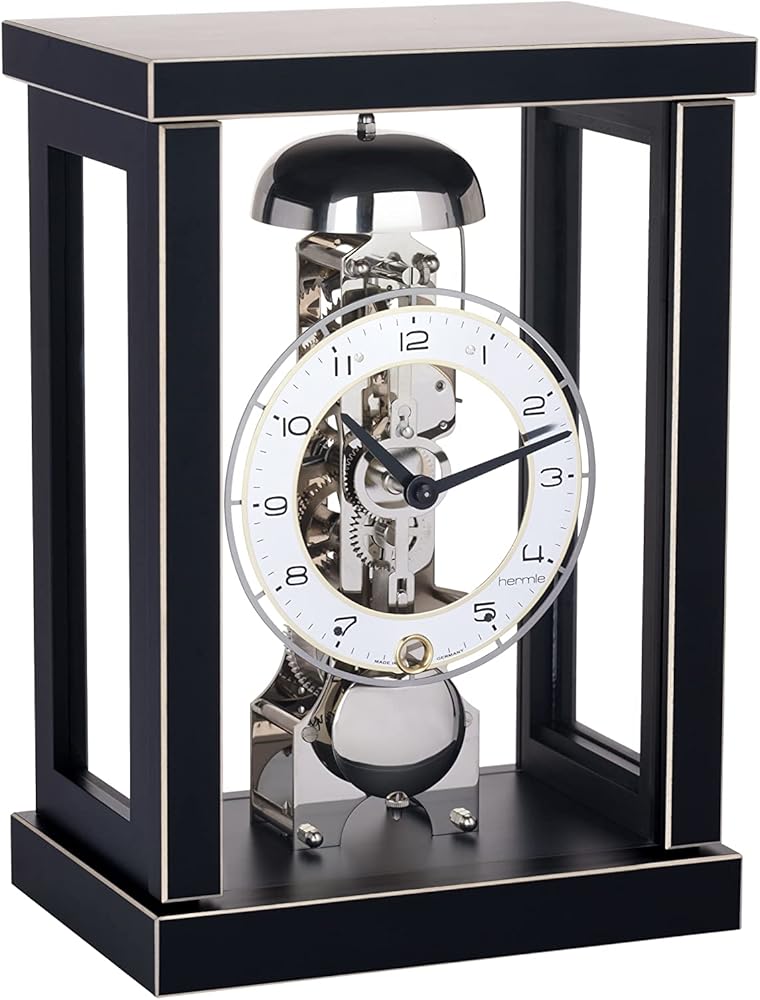 This Hermle table clock is of course also made in Germany. The modern table clock has a puristic design with wooden housing in different colour variations. The mechanical movement has 14 days of movement with hourly blow on bell.