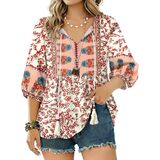 تُظهر البلوزات النسائية ذات الأزهار مزيجًا فريدًا من الطراز القديم والبوهيميلا والبيبي دول مع رقبة على شكل حرف V جذابة ورباط أمامي قابل للتعديل وأكمام فضفاضة بطول 3/4. التونيك النسائي مطوي حول منطقة الصدر بنقشة زهور أنيقة، مما يضيف لمسة من الشعور المرح واللطيف، وهو مثالي لفصلي الربيع والصيف، مع الحفاظ على مظهر يلفت الأنظار.