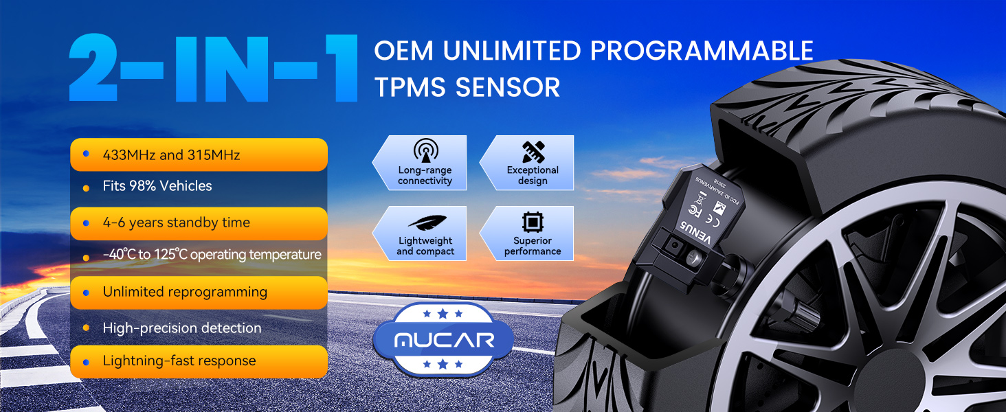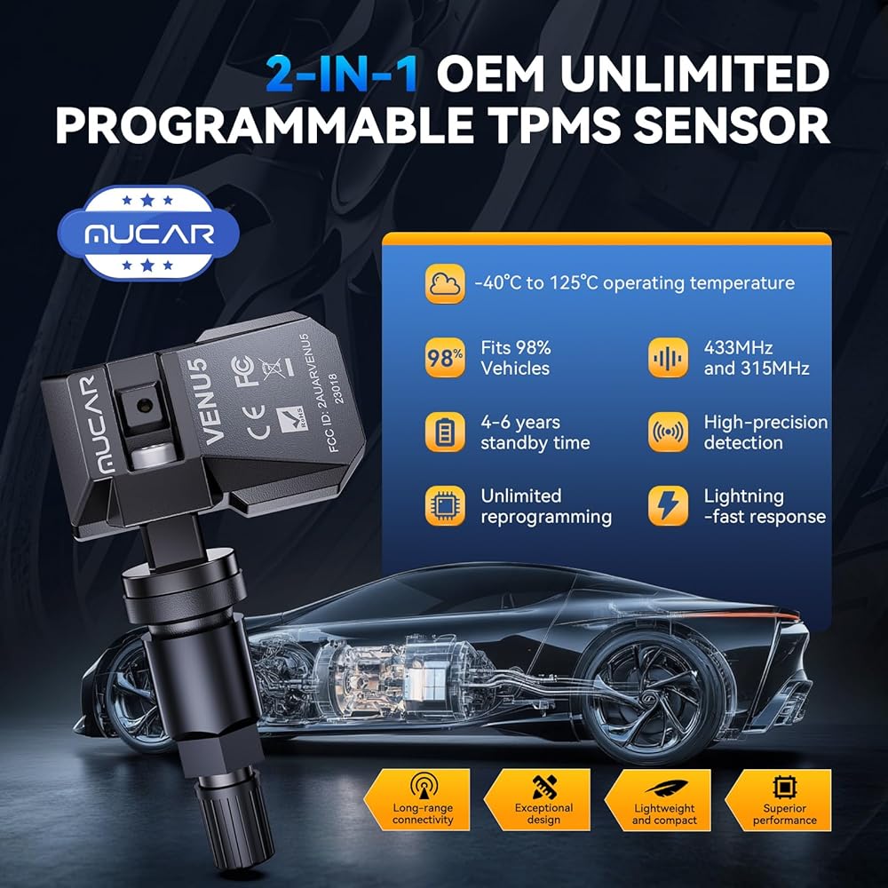 مستشعر MUCAR TPMS 4 قطع مستشعر ضغط الإطارات MUCAR VENU5، مستشعر عالمي 2 في 1 433/315 ميجا هرتز OEM TPMS، برمجة غير محدودة لـ MUCAR T261 وVENU I-Pro فقط، يناسب 98% من المركبات