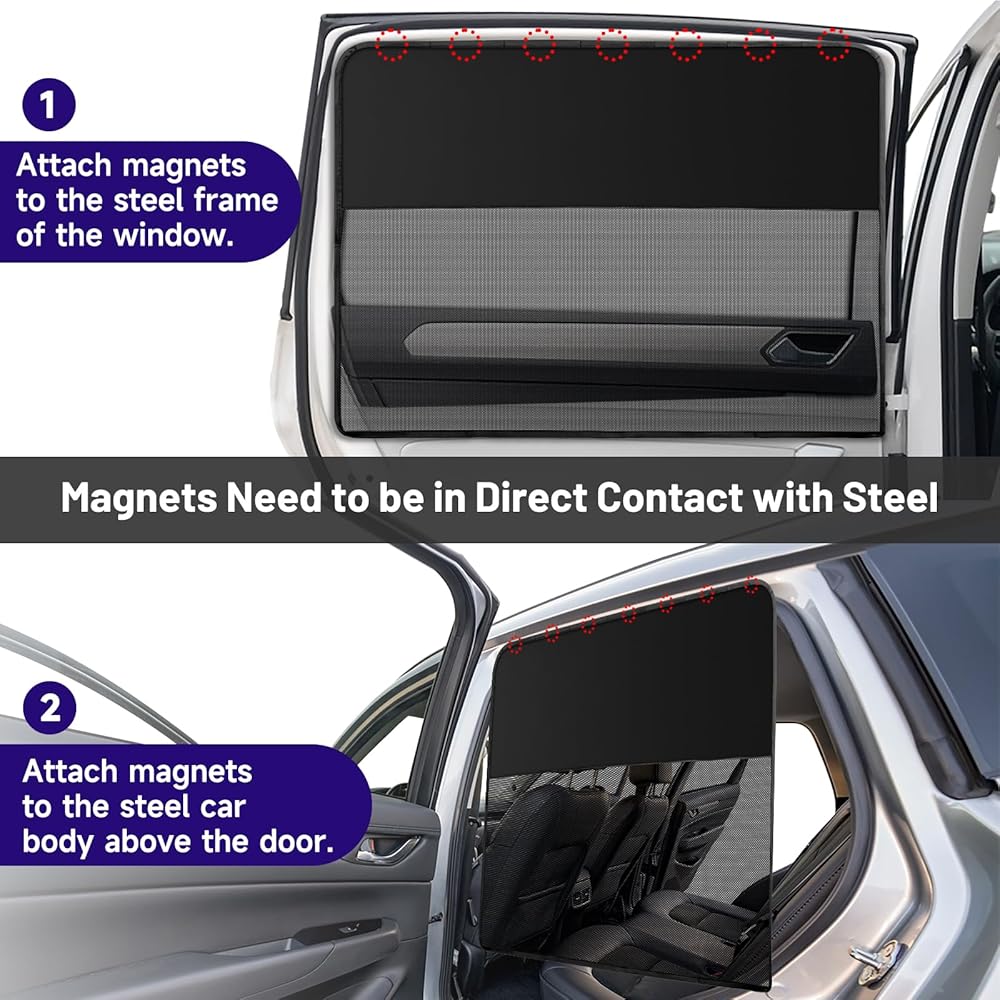 • سهلة الاستخدام: تحتوي كل مظلة شمسية على 7 مغناطيسات قوية في الأعلى، والتي يمكن أن تضمن بقاء مظلة الشمس ثابتة. كل ما عليك فعله هو ربط المغناطيسات بإطارات النوافذ الفولاذية أو إطارات الأبواب. يرجى ملاحظة أنه غير مناسب للنوافذ بدون إطار مثل نوافذ تيسلا.