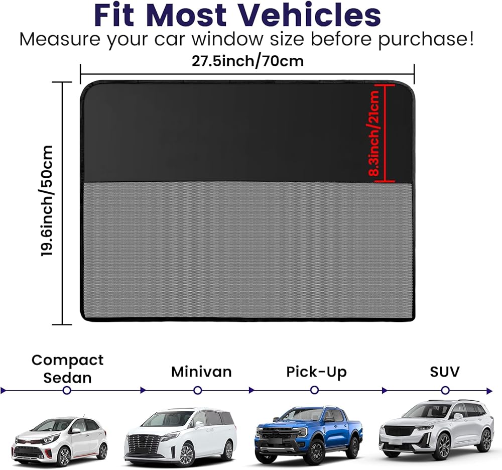 • حول المقاس: الأبعاد 26.7 × 19.7 بوصة/68 × 50 سم. يناسب سيارات الركاب القياسية ذات النوافذ ذات الحجم العادي، وسيارات الدفع الرباعي، والشاحنات الصغيرة، وMPV والشاحنات، ولكن بالنسبة للنوافذ الكبيرة، قد لا يوفر هذا الظل تغطية كاملة. قبل الشراء، يرجى قياس حجم نافذة سيارتك.