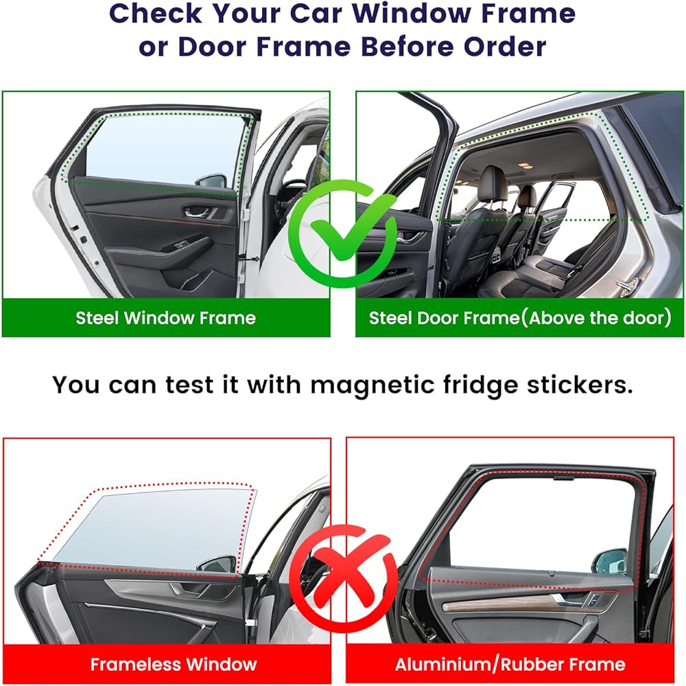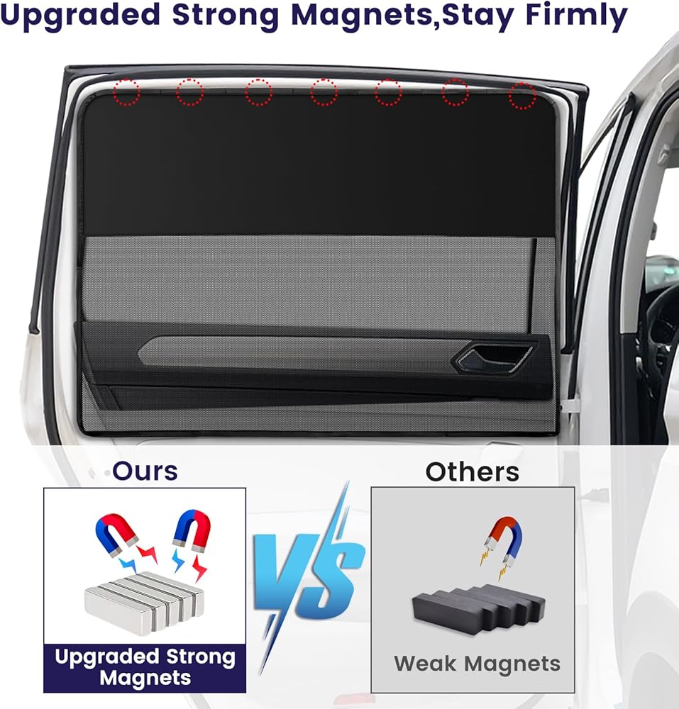 • مغناطيسات قوية مطورة: قمنا بترقية مغناطيسات مظلة الشمس هذه لجعلها أكثر مغناطيسية. يرجى ملاحظة أن المظلات الشمسية المغناطيسية يجب أن تكون على اتصال مباشر بالفولاذ/الحديد لتكون أقوى. إذا كان باب سيارتك يحتوي على القليل من الحديد أو كان مغلفًا بمادة غير معدنية، فإن المغناطيس سيكون ضعيفًا ويتداخل مع الاستخدام.