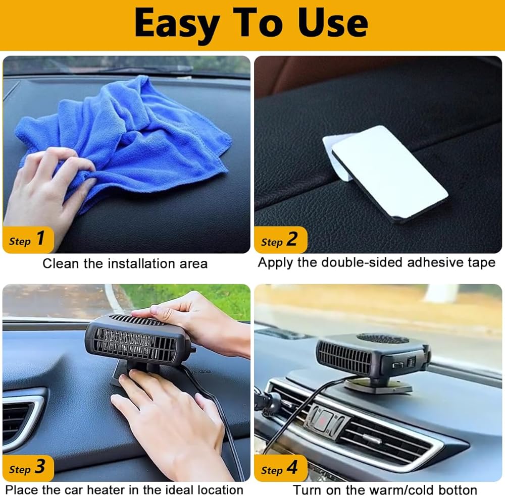 • 【سهل التركيب والاستخدام】يتم تشغيل مزيل الصقيع المحمول من سخان السيارة بواسطة منفذ ولاعة السجائر 12 فولت ويمكن إدخاله بسهولة من خلال مقبس ولاعة السجائر. اضغط على المروحة أو مفتاح الحرارة لبدء العمل. القاعدة مجهزة بشريط على الوجهين. يمكنك استخدام شريط لاصق على الوجهين لتثبيت سخان السيارة في الوضع الذي تفضله.
