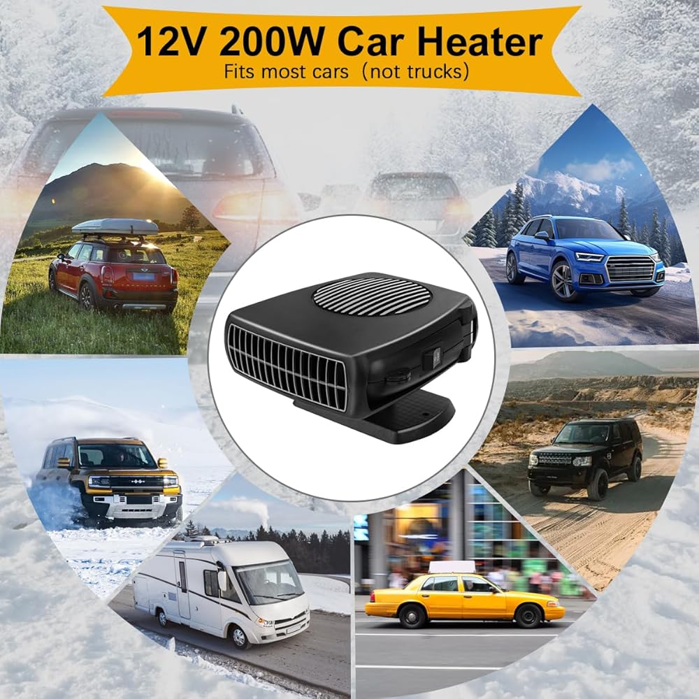 سخان السيارة، 200 وات 12 فولت مزيل ضباب ومزيل الصقيع للزجاج الأمامي، 2 في 1 أوضاع تسخين وتبريد سريع، مراوح مع ولاعة سجائر، قاعدة دوارة 360 درجة