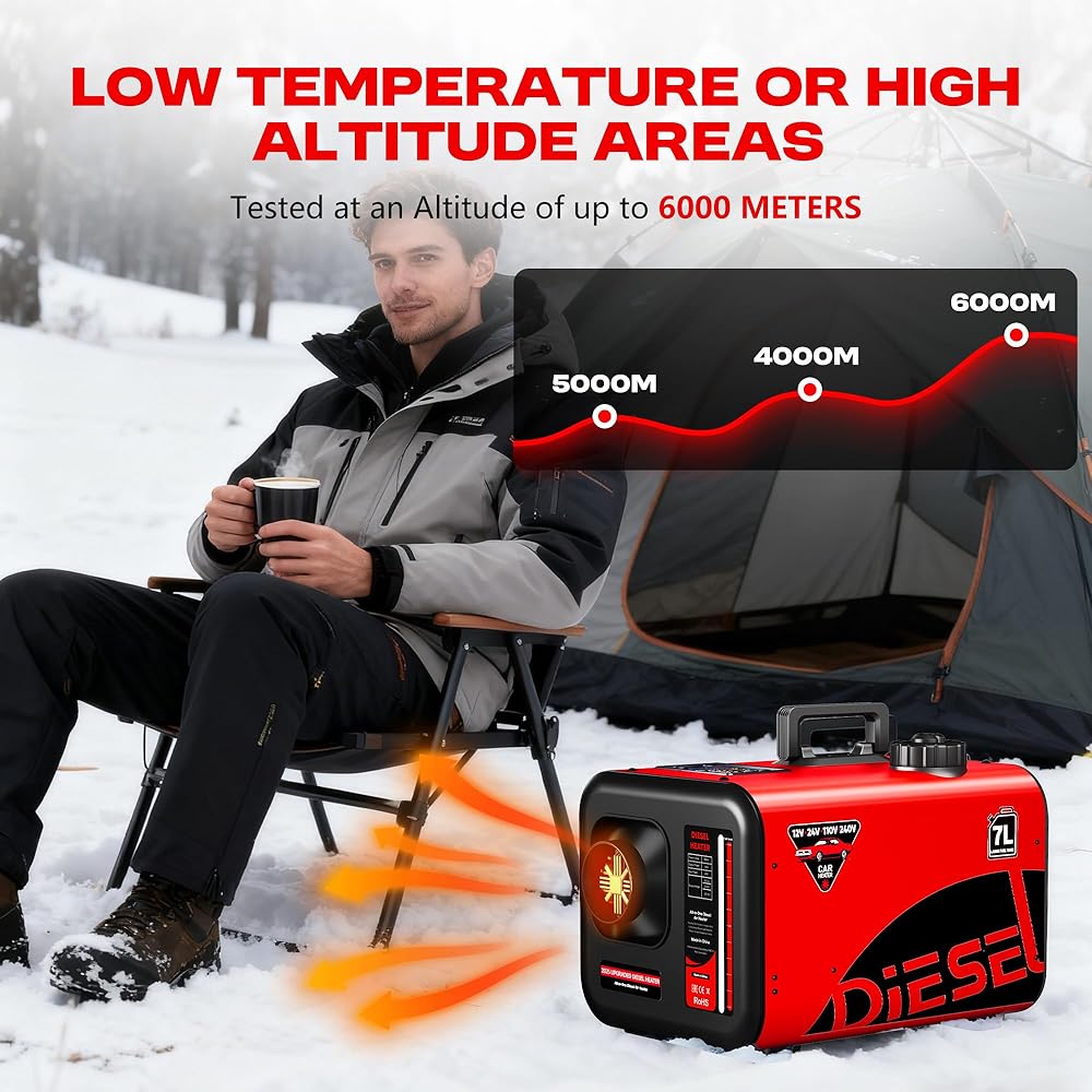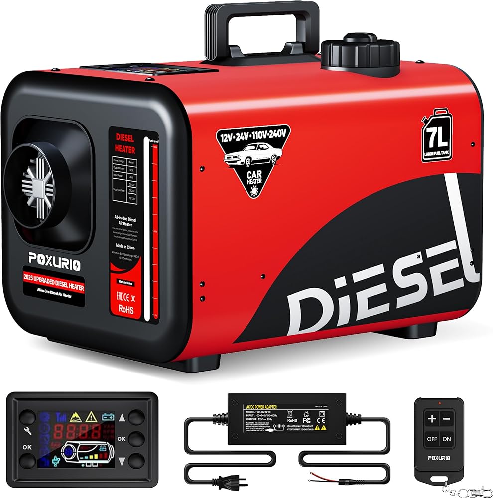 سخان ديزل كبير 7 لتر، 8 كيلو وات 240 فولت/110 فولت/12 فولت/24 فولت الكل في واحد سخان هواء ديزل مع مفتاح LCD، جهاز تحكم عن بعد، مناسب للشاحنة، RV، المنزل، السيارة، المعسكر، القارب، أحمر