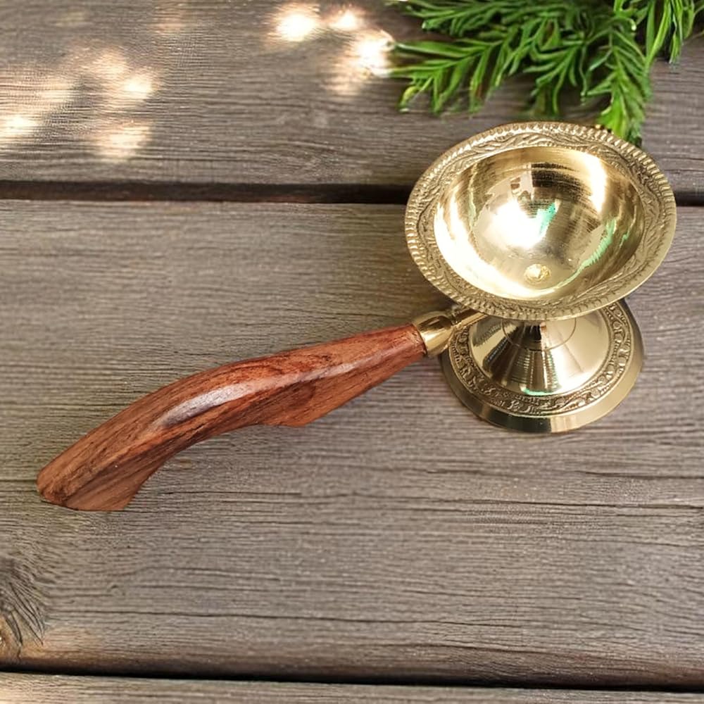 Illuminate your space with this beautifully crafted traditional brass deepak (oil lamp) featuring a convenient handle for easy carrying and positioning. This classic oil lamp design combines functionality with aesthetic appeal, making it perfect for traditional ceremonies, cultural celebrations, or as an elegant decorative piece. The durable brass construction ensures long-lasting use while developing a beautiful patina over time. The thoughtfully designed handle allows for safe movement even when the lamp is lit. Whether used for religious ceremonies, cultural festivities, or simply as an atmospheric lighting element, this brass deepak brings a touch of traditional charm to any setting. The lamp's timeless design makes it an excellent addition to both traditional and contemporary home decor, serving as both a functional light source and an artistic accent piece.