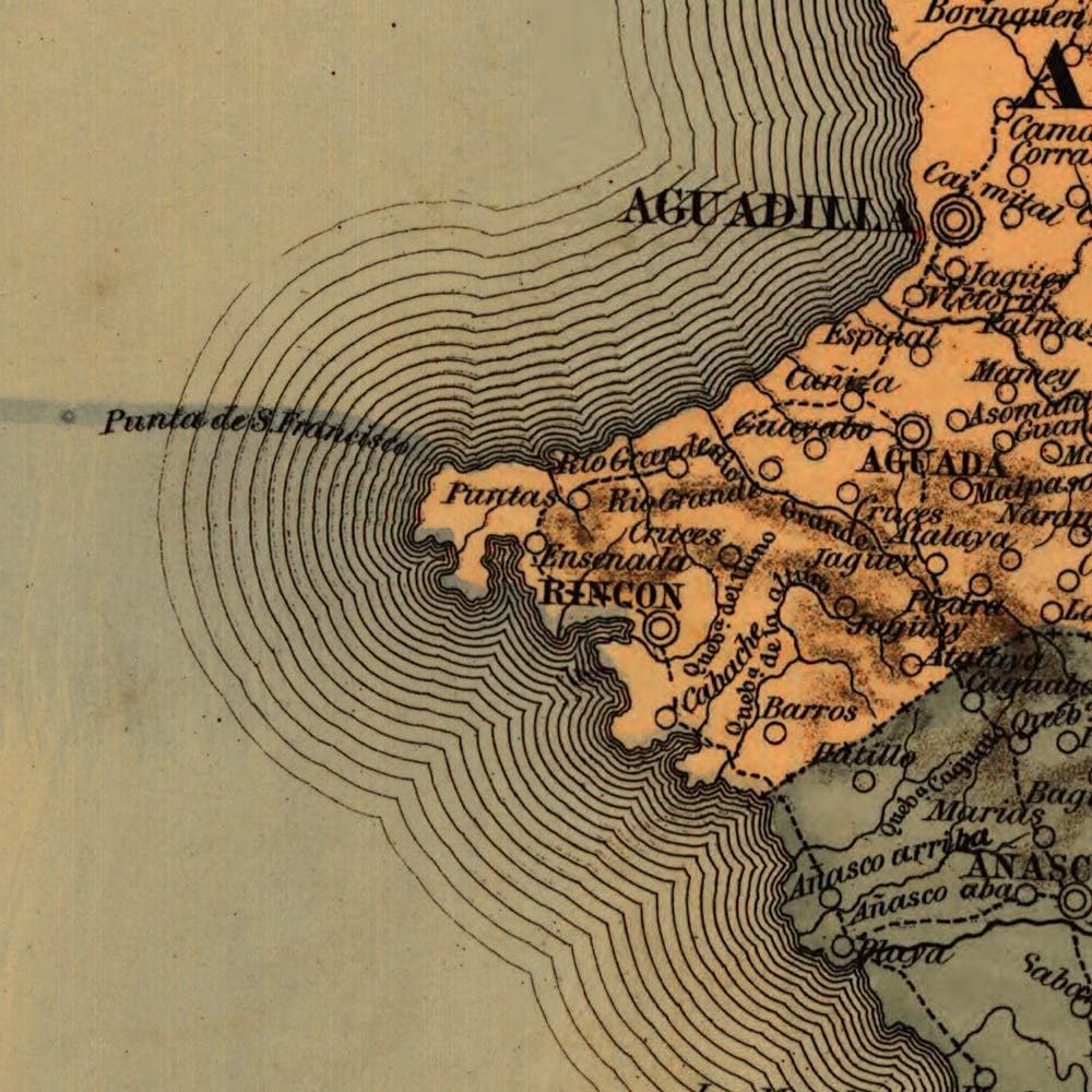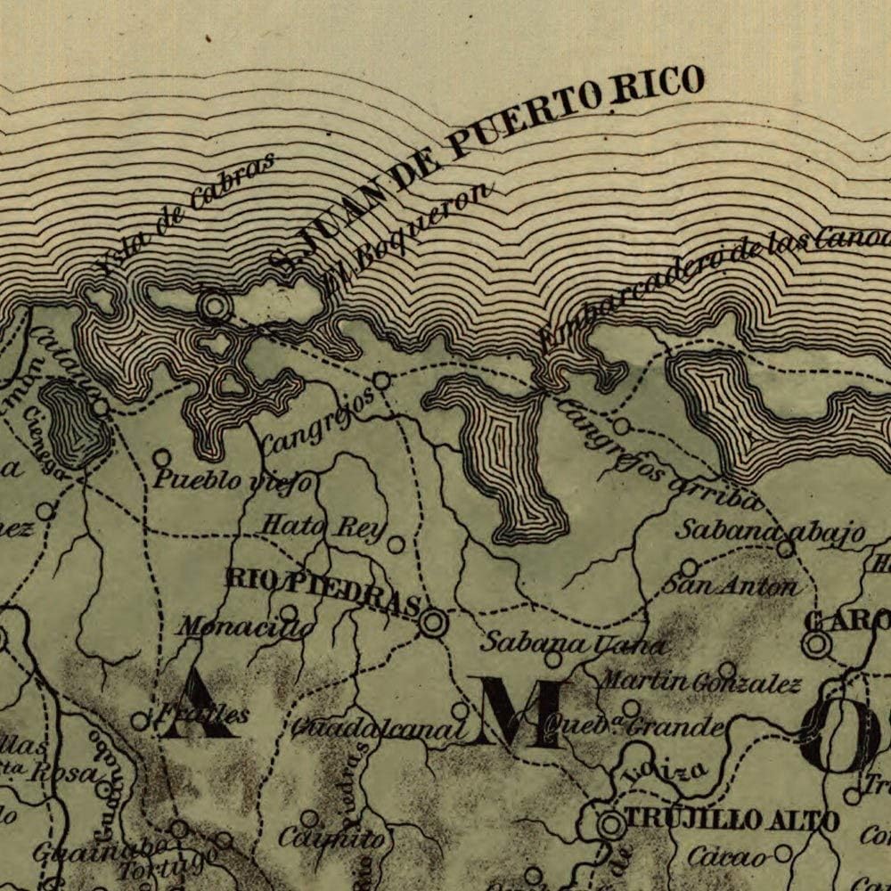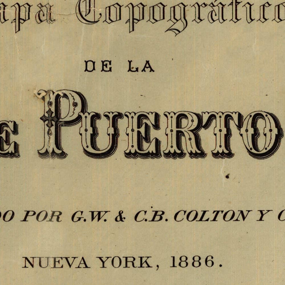 خرائط Antiguos Topografico de la Isla de Puerto Rico حوالي عام 1886 | ديكور حائط عتيق | ملصق طباعة فنية | مقاس 24 × 36 بوصة (610 × 915 ملم)