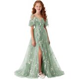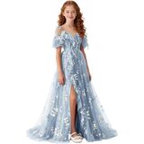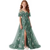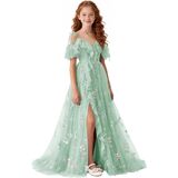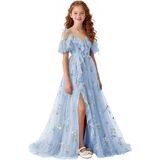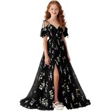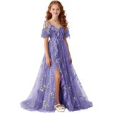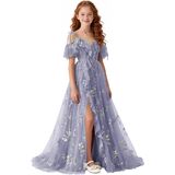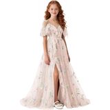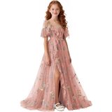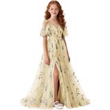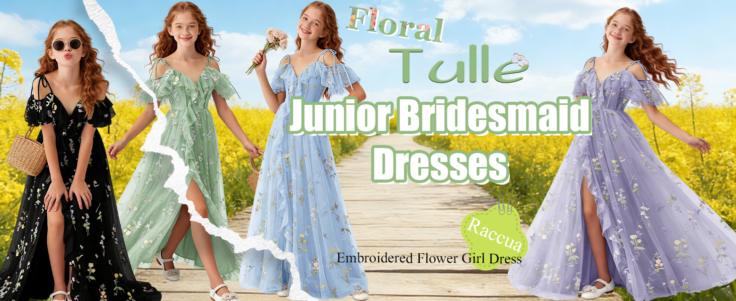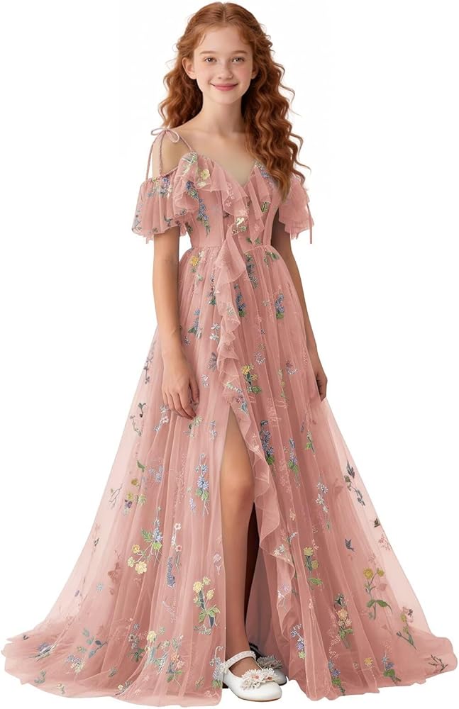 تصميم فستان الزهور للربيع والصيف: صورة ظلية بدون أكتاف ورقبة على شكل حرف V مع زخرفة مكشكشة، فستان فتاة الزهور من التل المطرز بالورود، فتحة أمامية عالية تضيف حركة ديناميكية، وأشرطة ربط قابلة للتعديل تسمح بملاءمة مخصصة، مما يضمن الراحة والشخصية. اختيار رومانسي وأنيق للفتيات الزهور، ووصيفات العروس الصغار، وحاضري المناسبات الرسمية للمراهقين