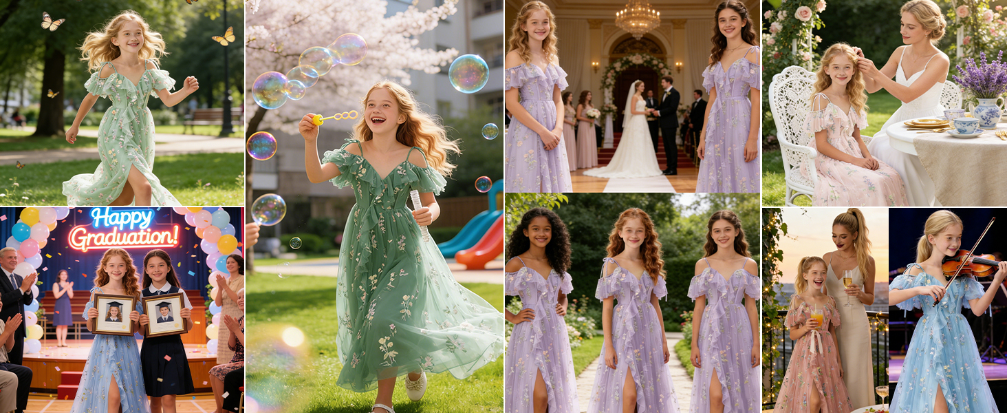 مناسبات فساتين البنات: فساتين التول هذه مناسبة لحفلات الزفاف، والمهرجانات، وحفلات بلوغ الخامسة من العمر، والتواصل، وتجمعات العطلات، وحفلات الحديقة، وليالي الحفلات الراقصة، والتقاط الصور، والحفلات الخيرية، وأعياد الميلاد، والكريسماس، والذكرى السنوية، وحفلات استقبال المولود الجديد، وحفلات الزفاف، وحفلات التخرج، وحفلات العودة إلى الوطن، وعيد الفصح، وفستان فتاة الزهور أو فساتين المناسبات الخاصة الأخرى.