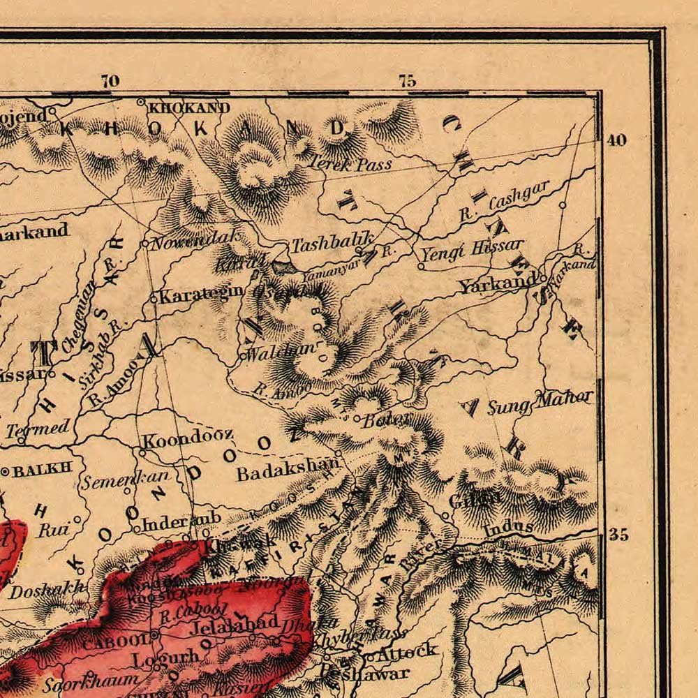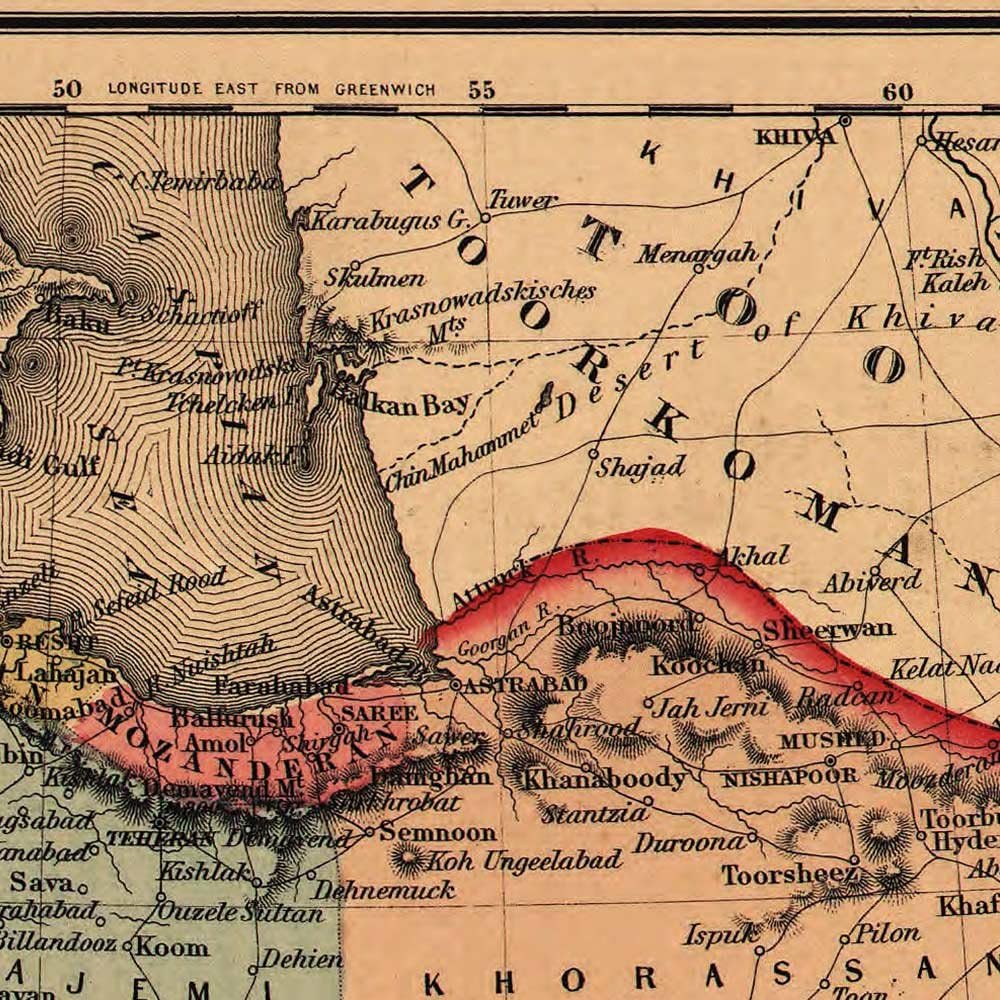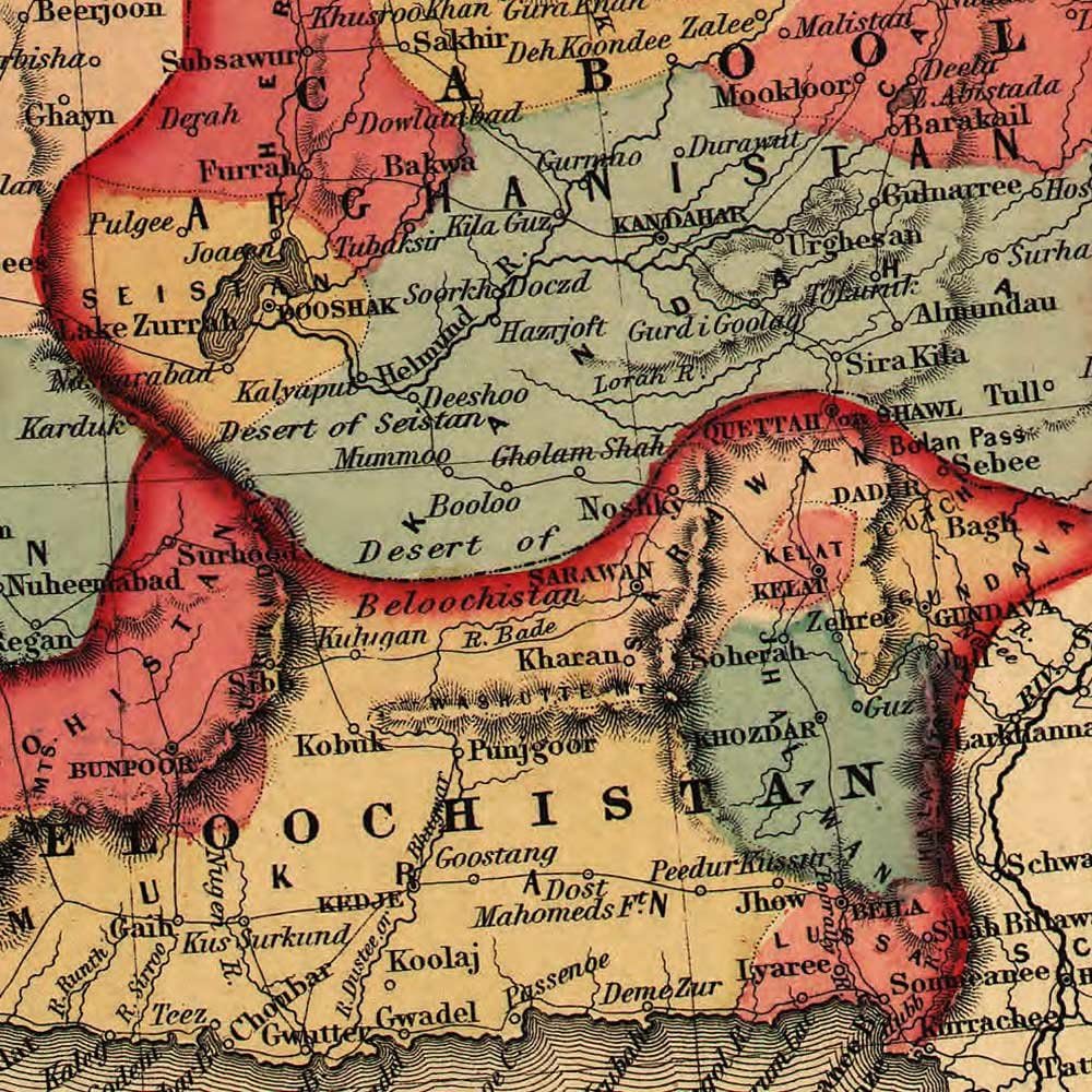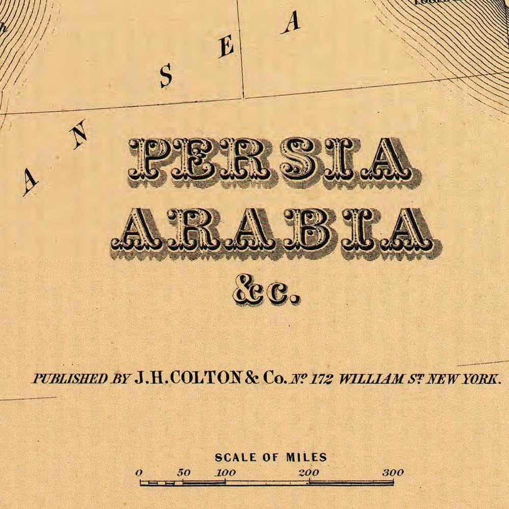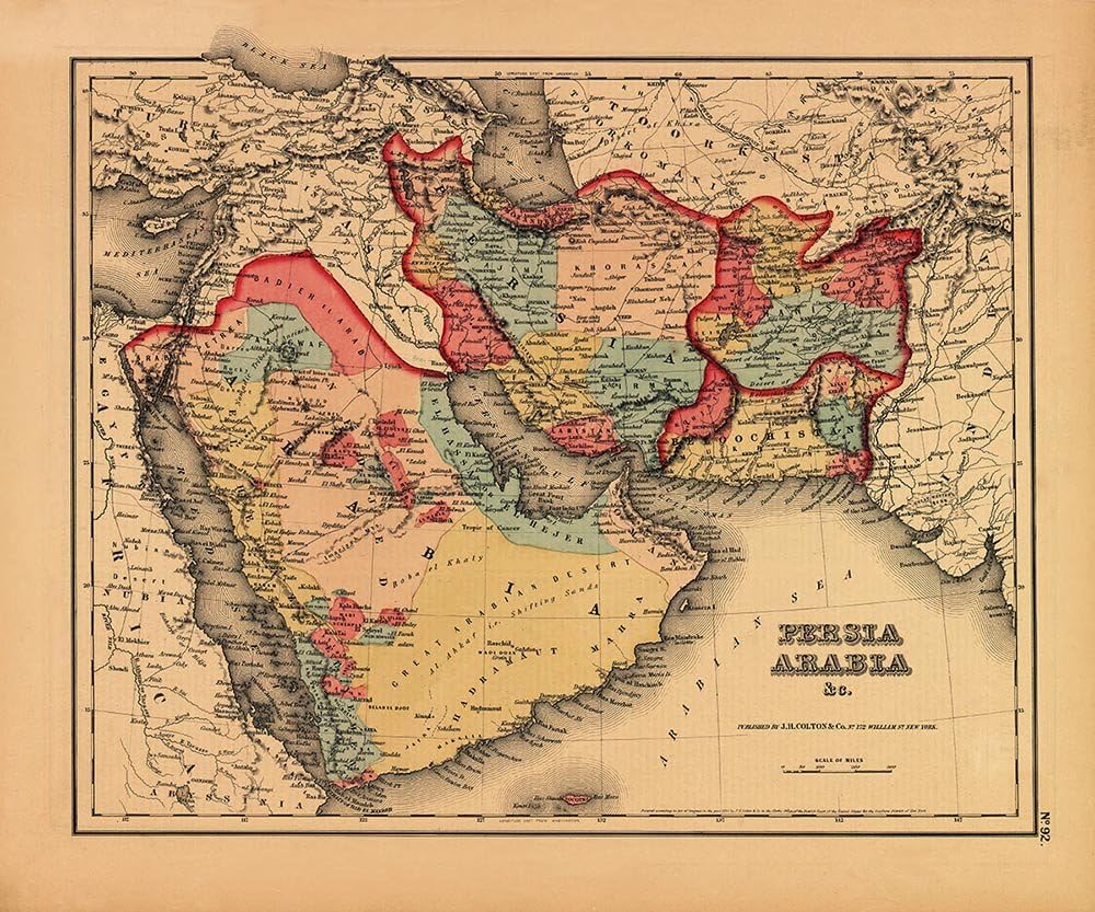 Crafted in 1855 by J.H. Colton and Company, this map provides a detailed depiction of the Middle East and Persia, featuring the Arabian Peninsula, Persia (present-day Iran), Afghanistan, and Baluchistan (modern-day Iran and Pakistan). Employing color to highlight borders, provinces, and settled areas, the map includes cities, mountains, roads, and topographical notes, showcasing a comprehensive understanding of the region's geography in mid-19th-century America. Adorned with decorative borders, the map, featured in Colton's General Atlas editions, combines precision and artistry, offering insight into the era's geographic knowledge and cultural aesthetics.