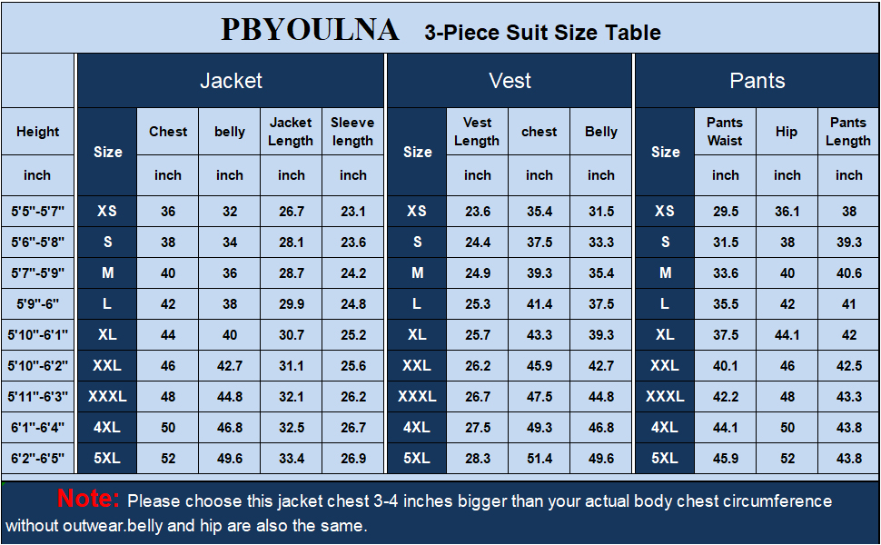 Careful Craftmanship : This men' s suit set with slim fit cut from upgraded 3D draping technology. It will fit your body better than a regular suit, and will be easier to present your perfect figure. Please check the size chart in the image carefully, check the note to make sure that your CHEST and WAIST fit ,DO NOT choose the size according to your habit. So as not to waste time and energy on returns.