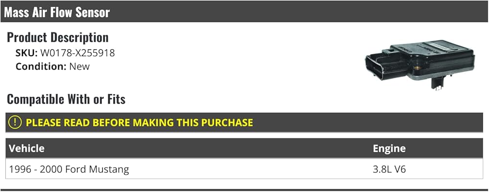 Mass Air Flow Sensor - Compatible with 1996 - 2000 Ford Mustang 3.8L V6Compatible With or Fits:1996 - 2000 Ford Mustang 3.8L V6