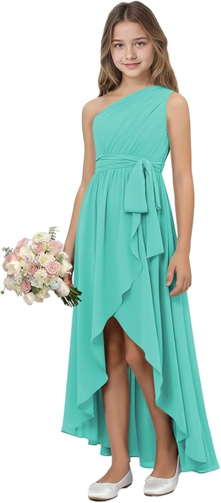 Girls Bridesmaid Dresses Features:One Shoulder Junior Bridesmaid Dresses,Chiffon Pleated Girls Bridesmaid Dresses with Slit,Sleeveless Flower Girl Dress for Teen Girls Wedding Guest with Belt Formal Dress features One Shoulder,Sleeveless,Side Slit,Belt,Pleated,Back Zipper,Floor-Length,A-Line,breezy,light fabric,practical and easy to wear,creating a perfect look for your girl!Long junior bridesmaid dresses are the best choice for different occasions!
