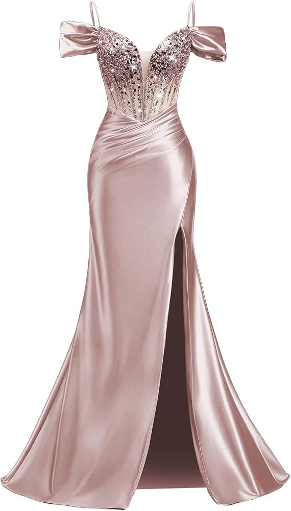 FEATURES: V Neck Satin Prom Dress, Beaded, Sparkly Sequins, Spaghetti Strap, Mermaid Prom Dress, Ruched, with Train, Side Slit, Corset Top, Floor Length, Open Back, Sleeveless, Pleated, Backless, The Satin Prom Dress Is The Best Choice For Your Different Occasions