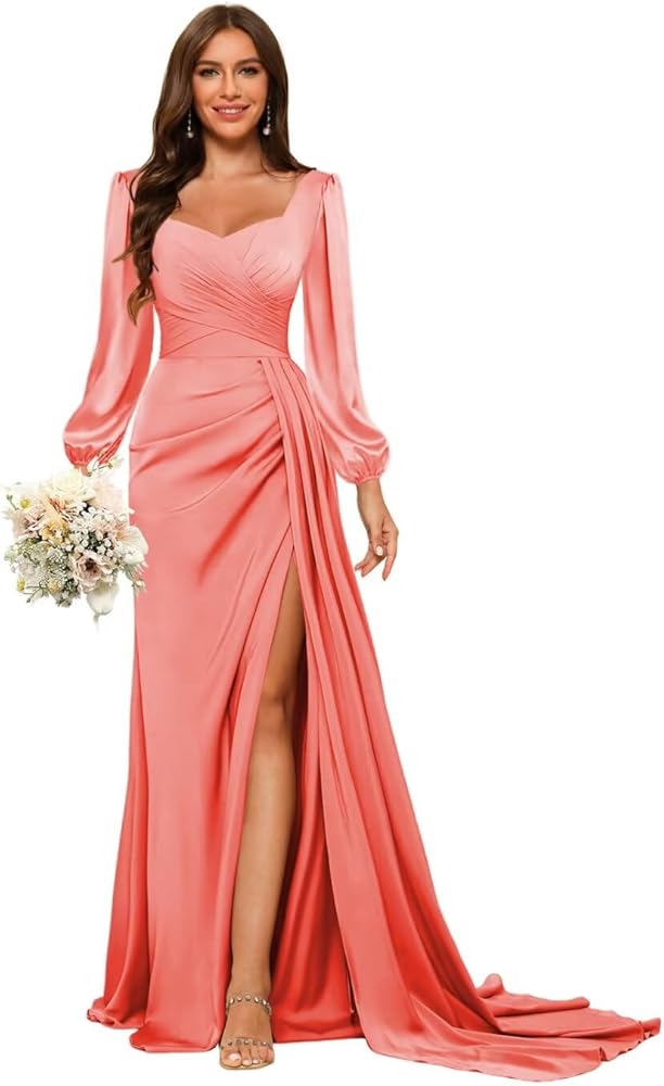 Features:Satin Square Neck Mermaid Prom Dress with Slit 2026,Pleated Long Formal Evening Dresses,Lace Up Back,Floor Length.
