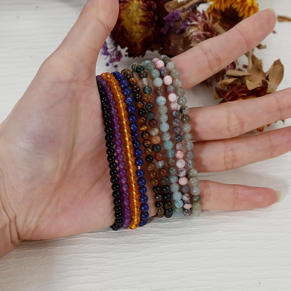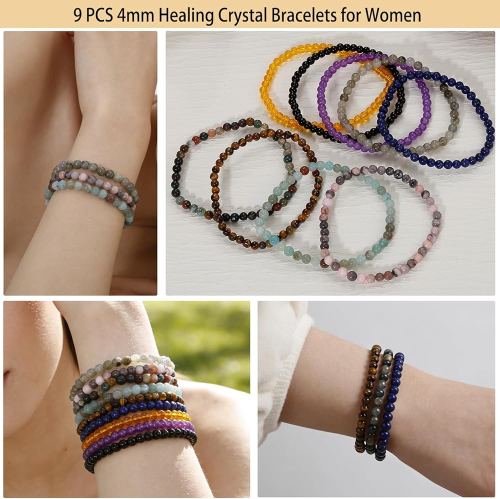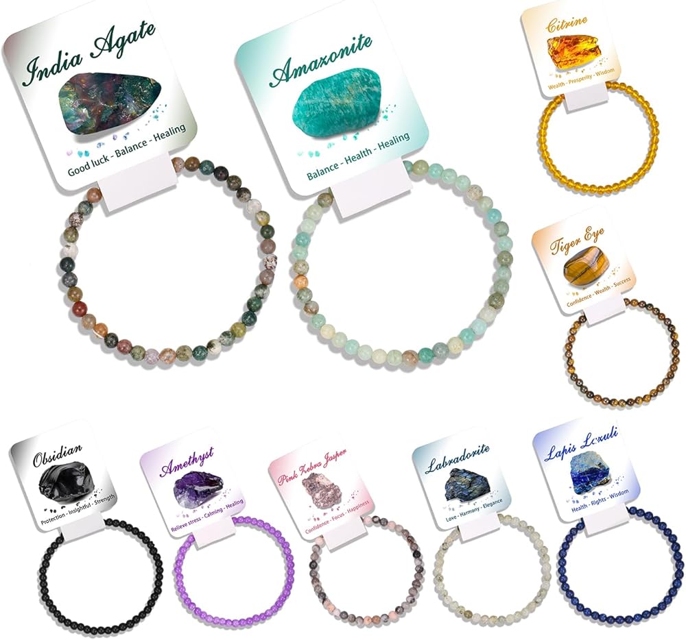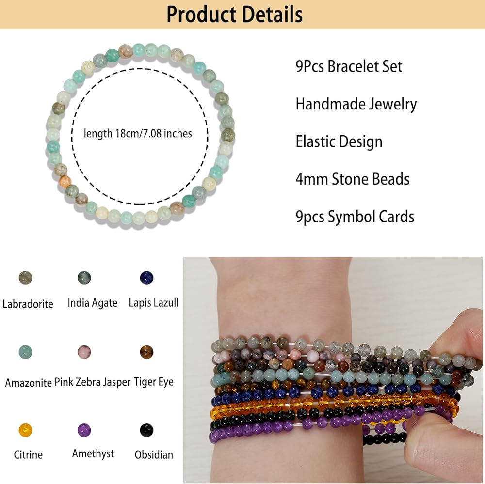 مجموعة أساور من الحجر الطبيعي: تسعة أساور من الخرز العلاجي الدائري مقاس 4 مم مصحوبة ببطاقات تهنئة رائعة تحمل قصصًا وطاقات فريدة؛ يجسد كل سوار من الكريستال صفات روحية مميزة، وينقل طاقات مختلفة