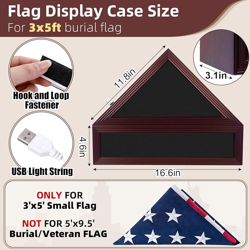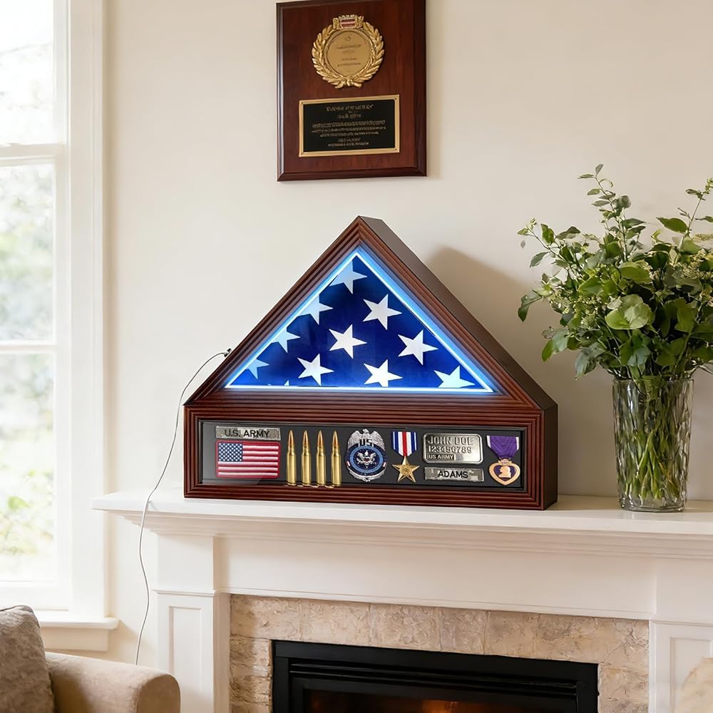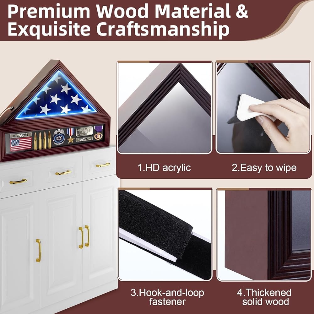 Burial Flag Display Case: This veteran burial flag display case features a dedicated triangular compartment, specially designed to showcase folded 3' x 5' American funeral flags, it serves as a sincere tribute to the valor and sacrifice of active-duty service members, retired veterans and fallen military personnel, making it a dignified display piece for homes, memorial gatherings and remembrance ceremonies, perfectly honoring the service of U.S. military heroes and their lasting contributions
