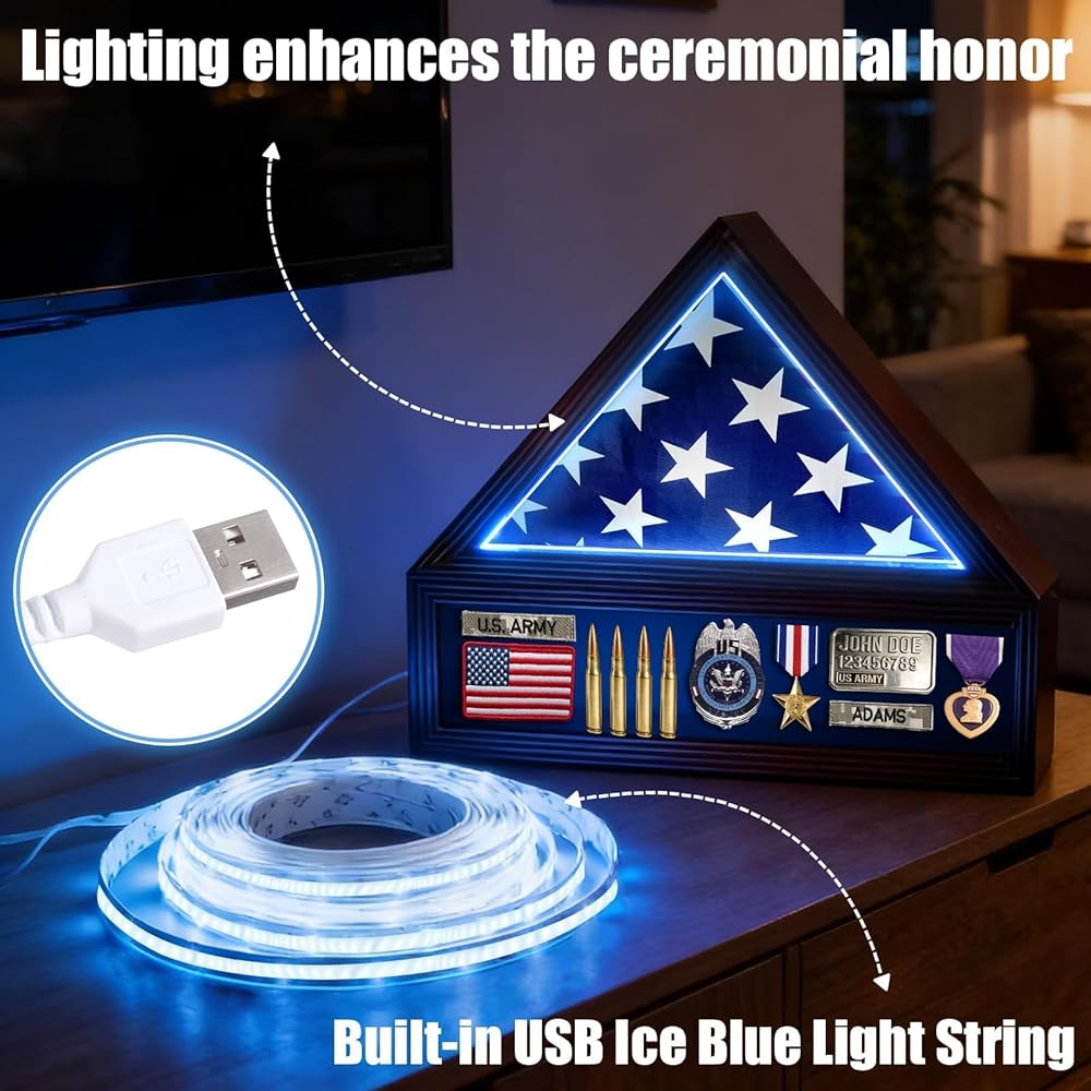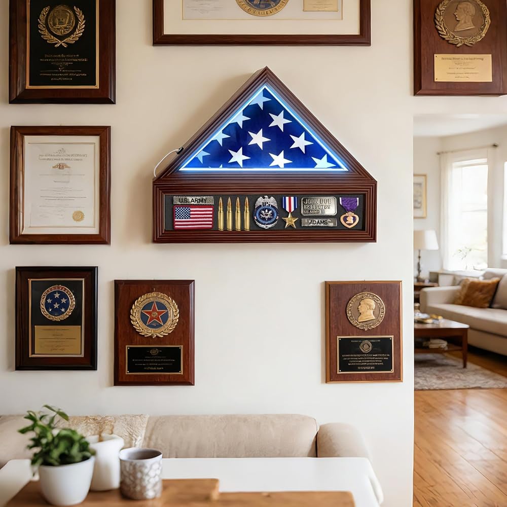 Flag Shadow Box with LED Light: This military veteran flag display case is equipped with built-in USB-powered LED lights, casting soft, warm illumination to highlight the details of folded flags, medals, creating a solemn and dignified display atmosphere. It offers flexible installation options, supporting both wall-mounted and tabletop placement to fit various spaces. Suitable for living rooms, home offices, military facilities and veteran service centers