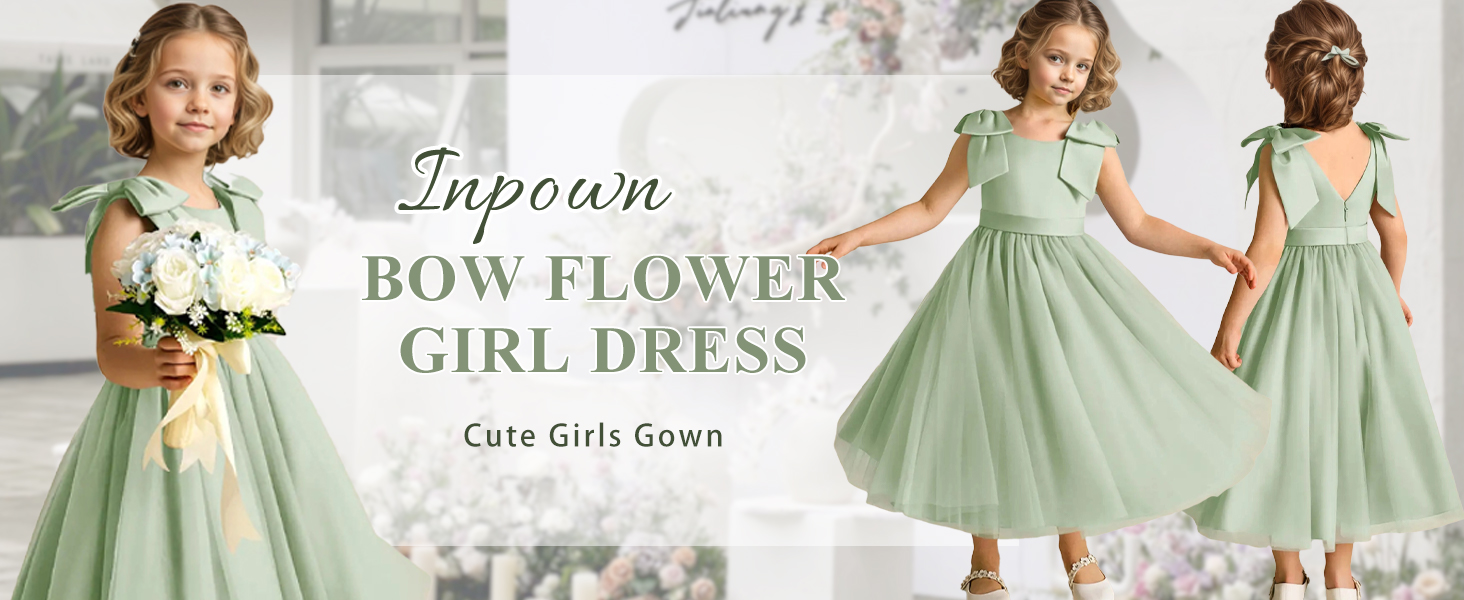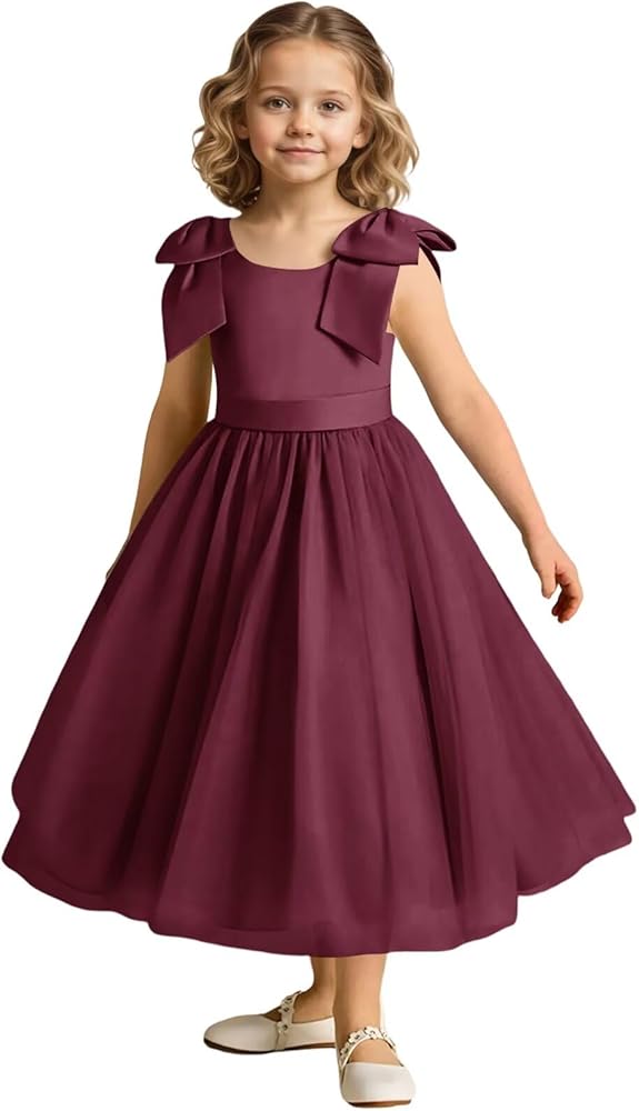 تصميم أنيق جاهز للزفاف: فستان مصنوع يدويًا. فستان من التول مع كتف فيونكة من الساتان + تفاصيل على شكل حرف V، صورة ظلية منسابة بطول الأرض تضيف لمسة خيالية. مثالية للفتيات الزهور، أو وصيفات العروس الصغيرة، أو المناسبات الرسمية.