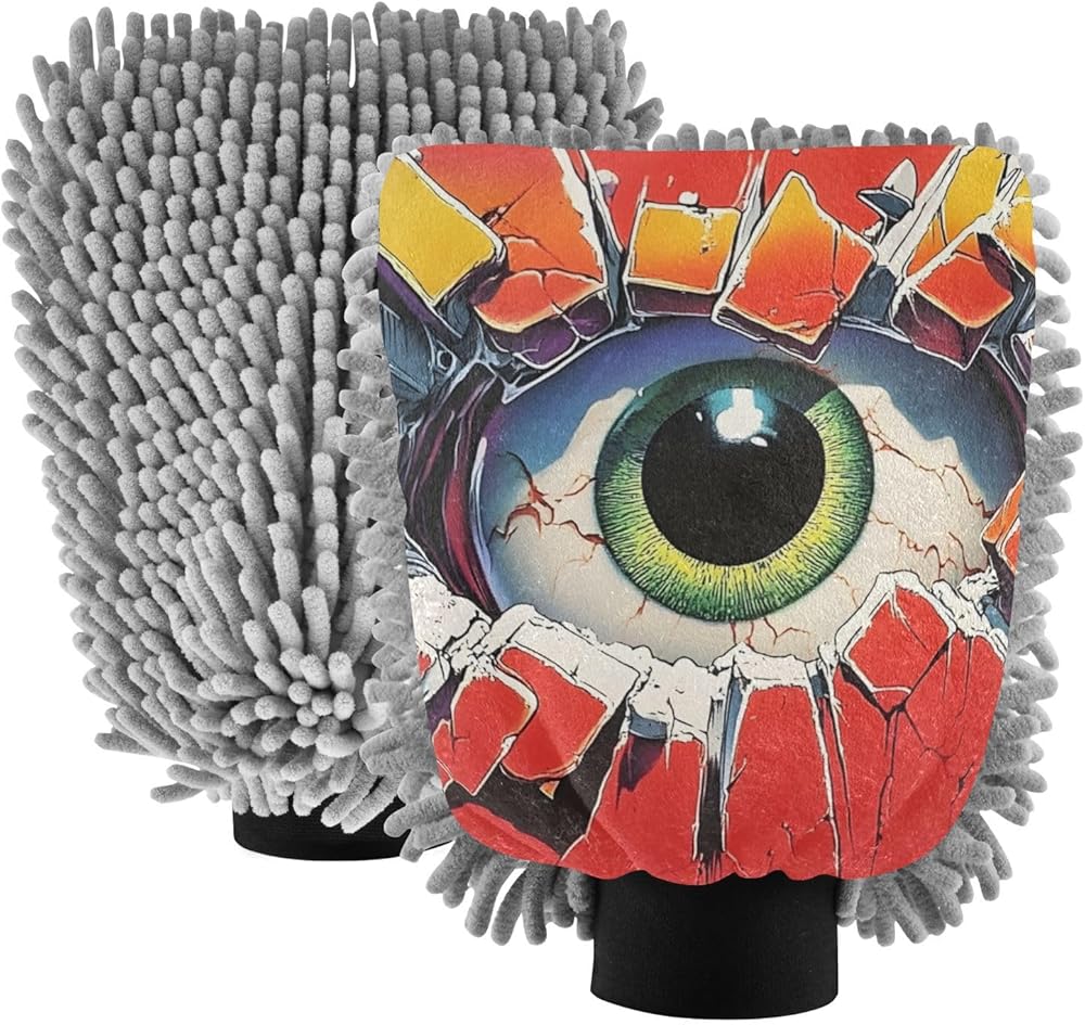 قفاز غسيل السيارات من AIXIWAWA، قفاز غسيل مقاوم للخدش، ماص للماء، 2 عبوة من طباعة جدار العين المتوسطة