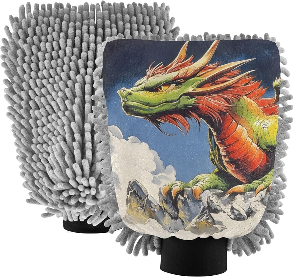 قفاز غسيل السيارات من AIXIWAWA، قفاز غسيل مقاوم للخدش، ماص للماء، 2 عبوة متوسطة الحجم مطبوع عليها رسوم متحركة تنين in Kuwait