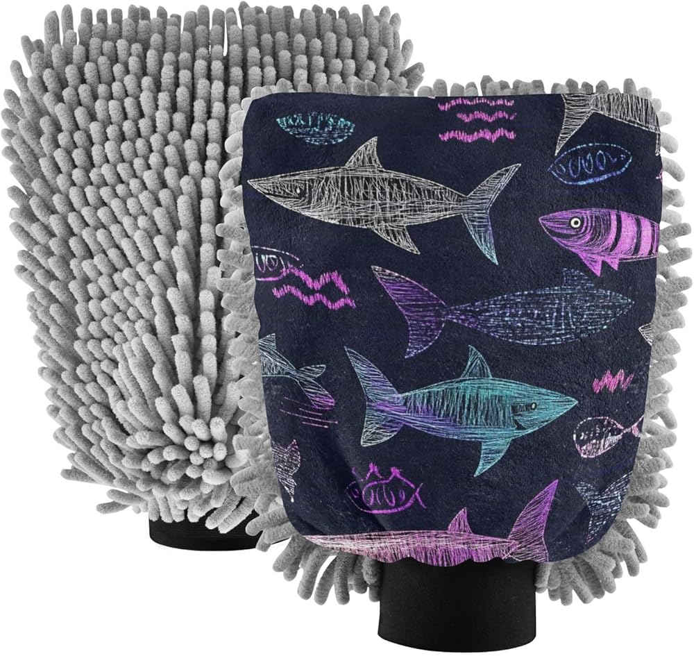 قفاز غسيل السيارات من AIXIWAWA، قفاز غسيل مقاوم للخدش، ماص للماء، 2 عبوة متوسطة الحجم مطبوعة بأسماك القرش in Kuwait