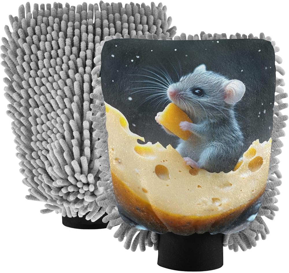 قفاز غسيل السيارات من AIXIWAWA، قفاز غسيل خالٍ من الخدوش، ماص للماء، 2 عبوة متوسطة الحجم مطبوع عليها جبن الفأر